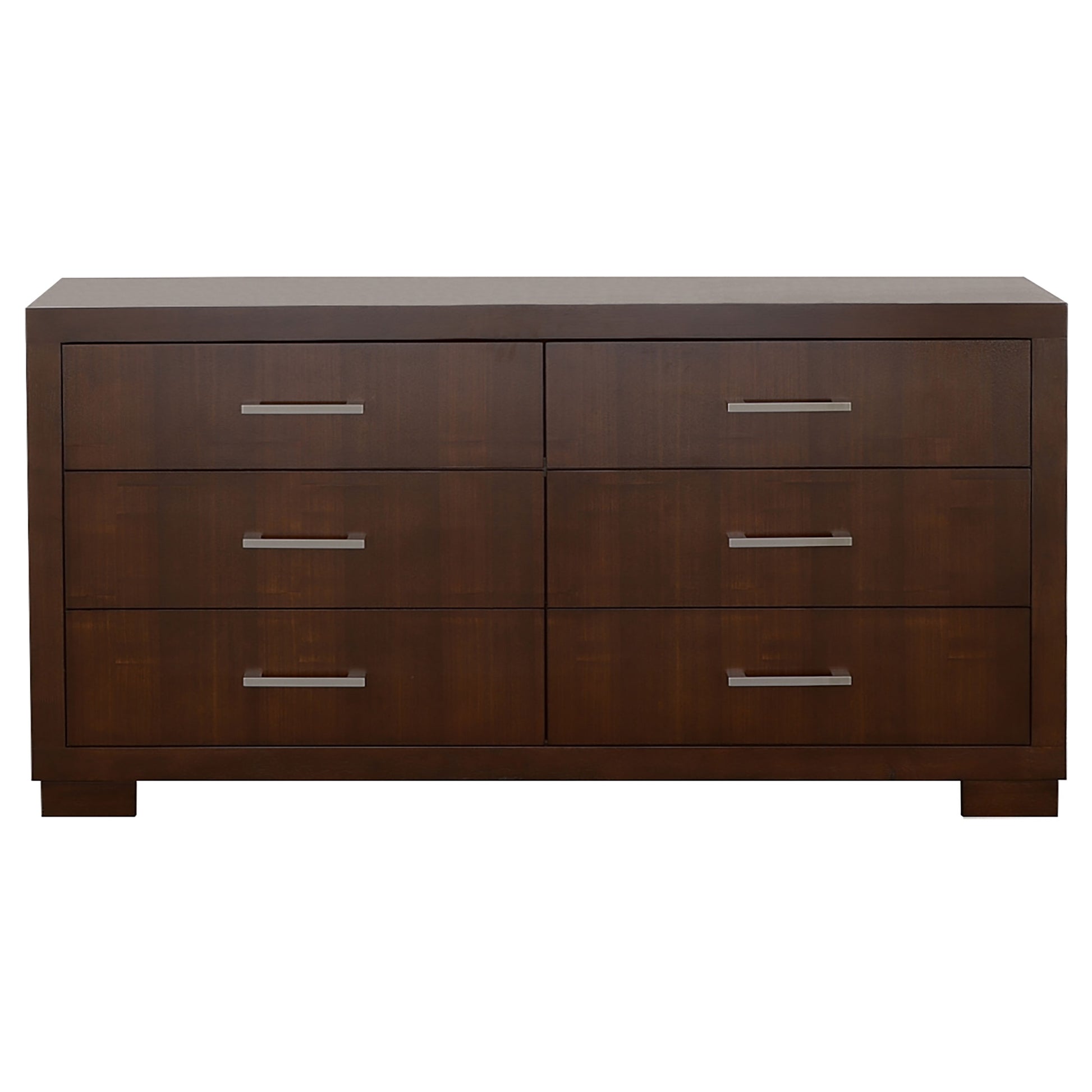 Breathe contemporary elegance and a crisp feel into an updated master or guest suite with this complete bedroom set. Linear design forms create a sharp aesthetic perfect for modern spaces, adding a fresh new feel. Centered with a stacked platform bed featuring a straight headboard, this set checks off all necessities in a list contributing to comfort and utility. Silver finish metal bar hardware offers an enticing standout feature, as case pieces sit atop bracketed corner feet. Set includes bed, two nightstands, one dresser, one mirror, and two wall panels.