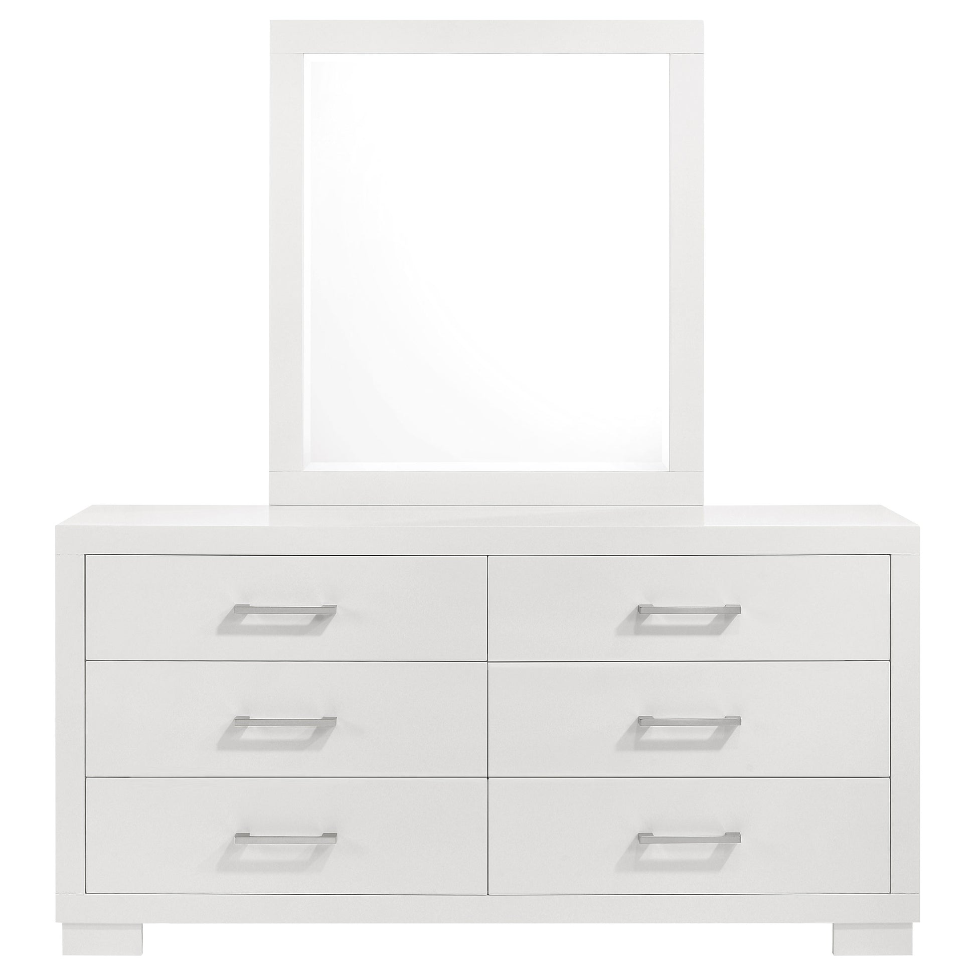 This contemporary dresser and square mirror set combines clean lines and modern design to bring elegant functionality to your bedroom. The six-drawer dresser, with a simple snow white finish and smooth silver handles, offers ample storage and organization space. Its felt-lined upper drawers protect delicate items, adding subtle glamour to its sleek silhouette. The solid wood construction ensures durability. The matching square mirror, with its crisp, clean frame, complements a range of decor styles, from traditional to contemporary, dressing up the dresser with its stark neutral color.