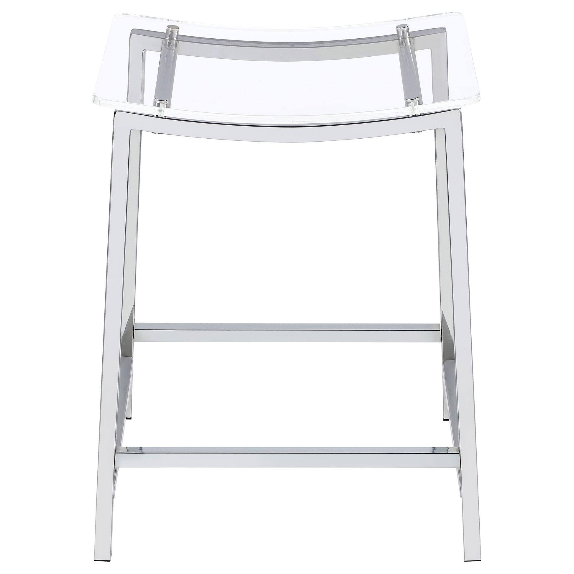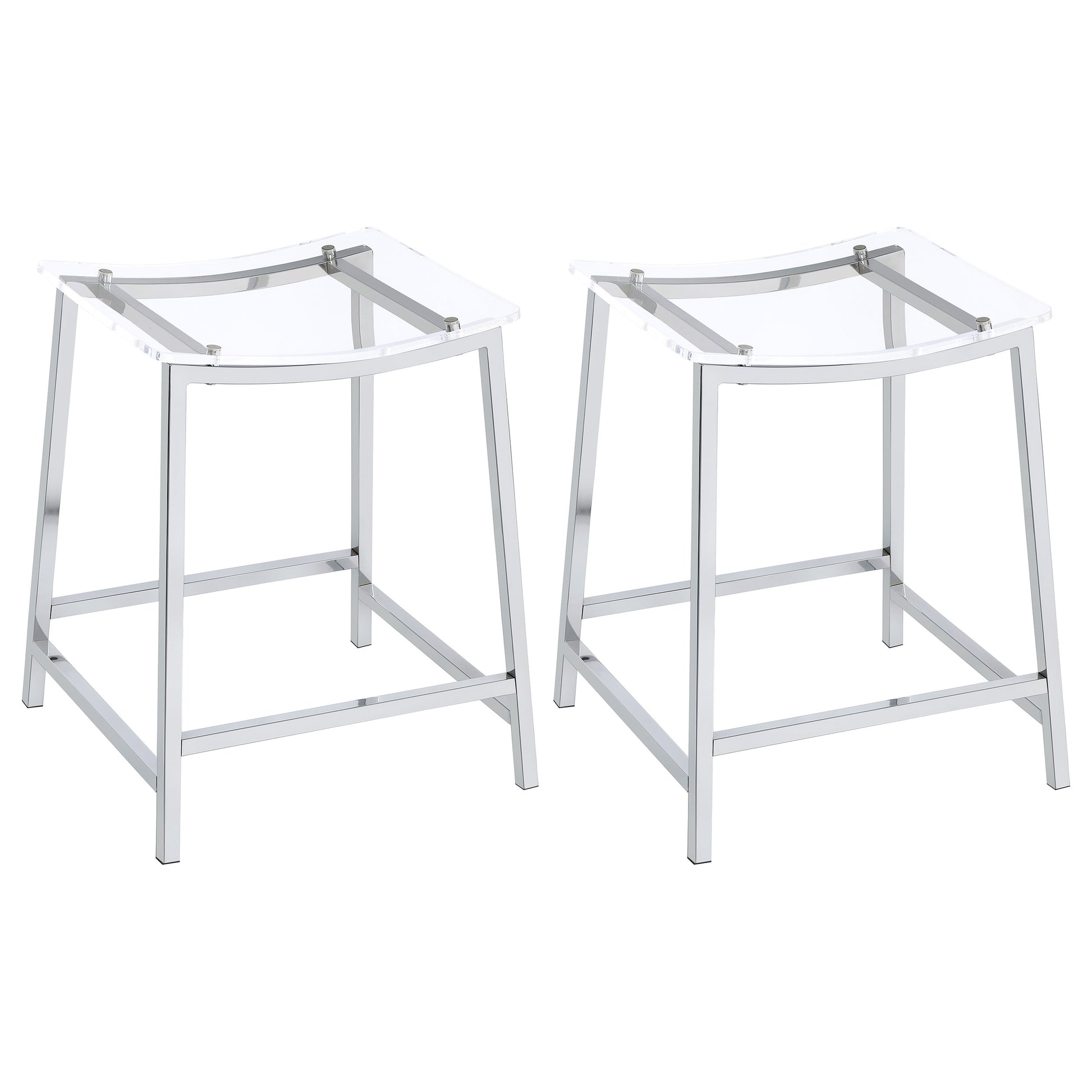Pull up a stool and enjoy a casual modern entertaining experience from the privacy of your home. This set of two counter-height stools reflects ultra-contemporary design standards using crisp modern materials. Gleaming chrome finish metal framing includes a two-bar seat support and built-in footrests. A gently curved seat made of acrylic reveals the nuts and bolts of metal framing. Add this stool set to a sleek kitchen island or lounge space.