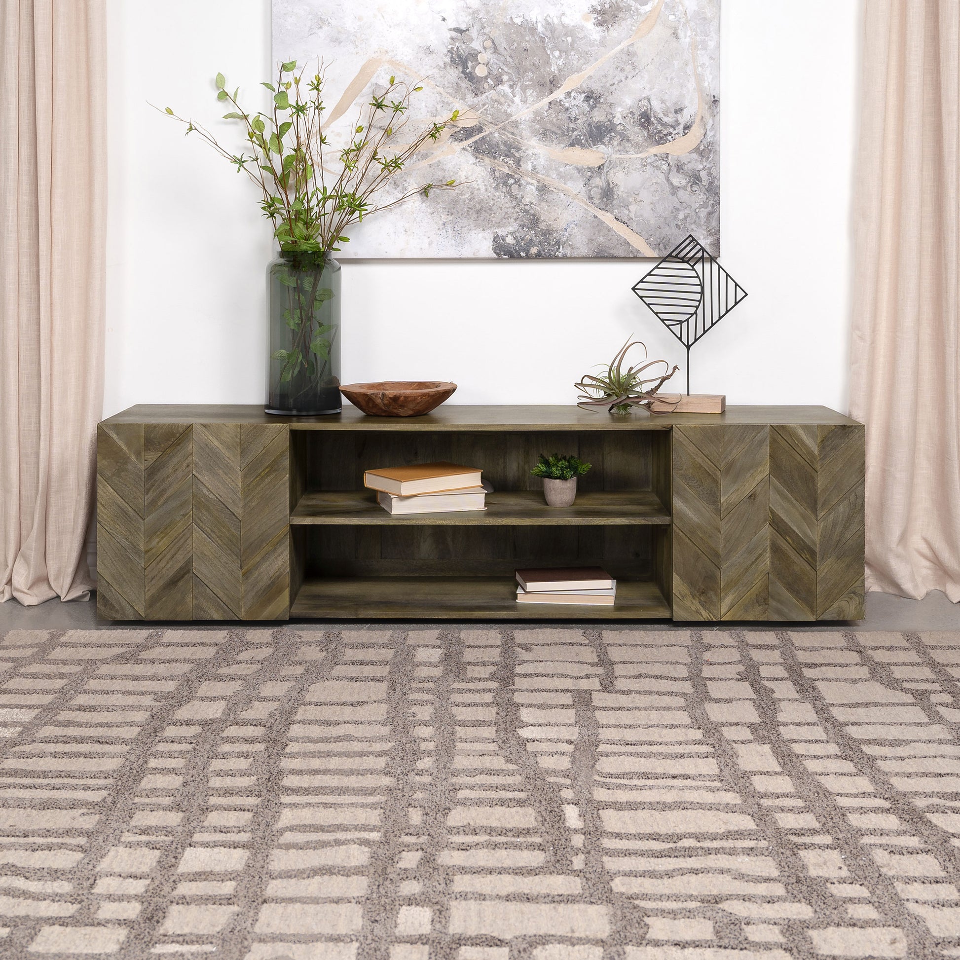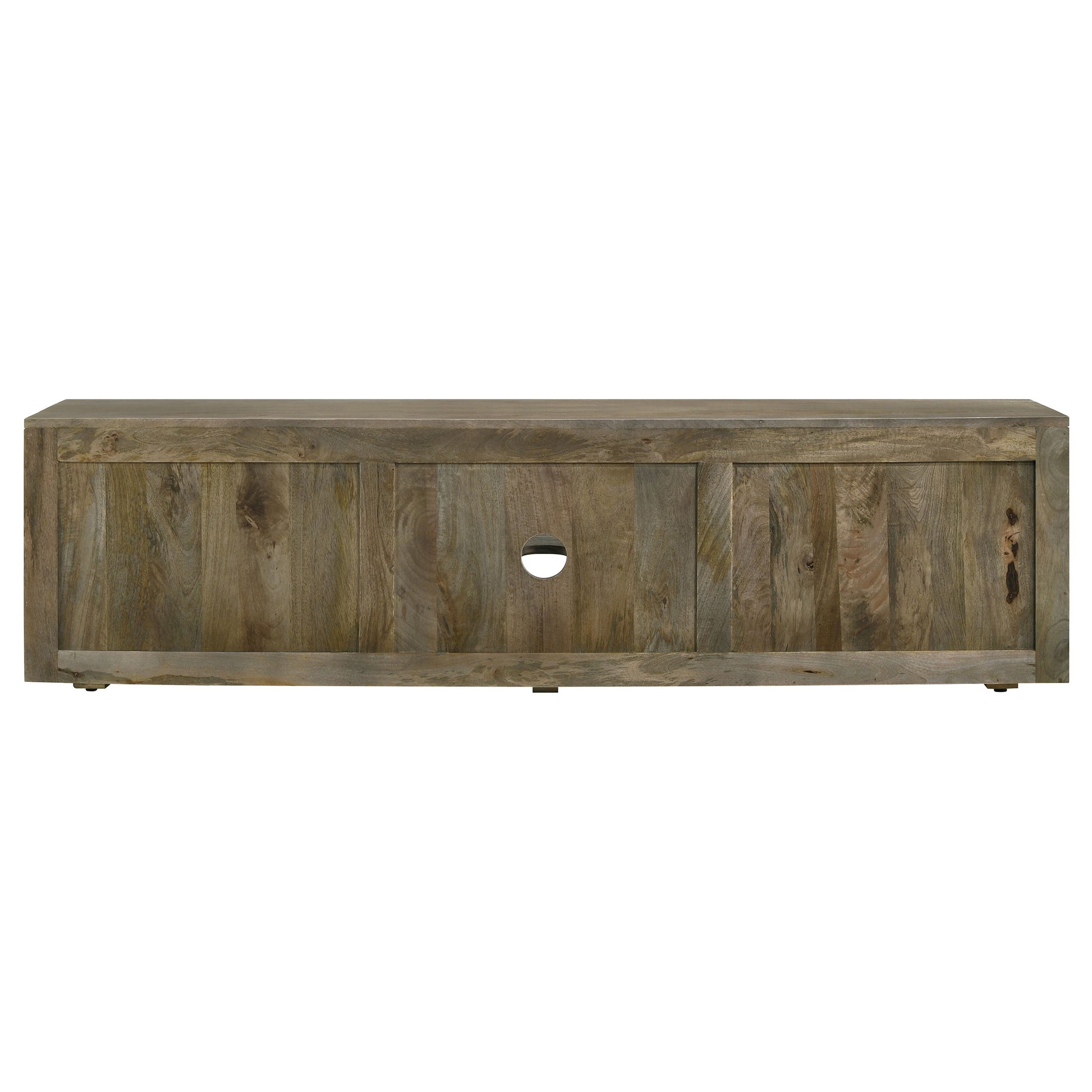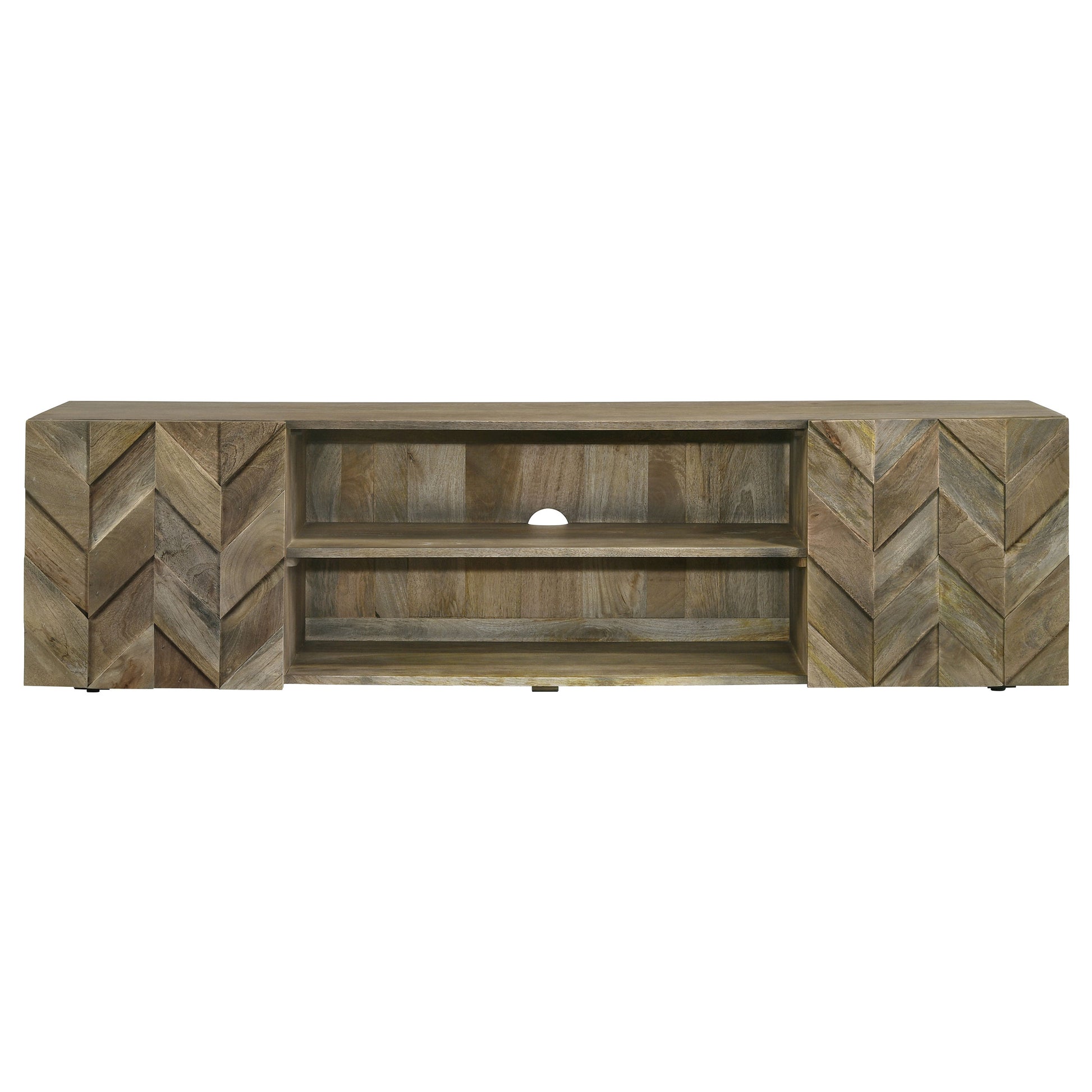 Nestle your TV atop this 70" media console, where the artistry of mango wood meets modern functionality. The rich, textured grains of the wood are arranged in a captivating veneer parquet, creating an intricate herringbone pattern that dances across the two door cabinets. This design not only adds a visual rhythm to your living space but also a tactile story of craftsmanship. The harmonious pattern, a time-honored classic, offers both a sense of history and contemporary flair. This TV stand accommodates TVs up to 80" and showcases the natural beauty and enduring charm of mango wood.