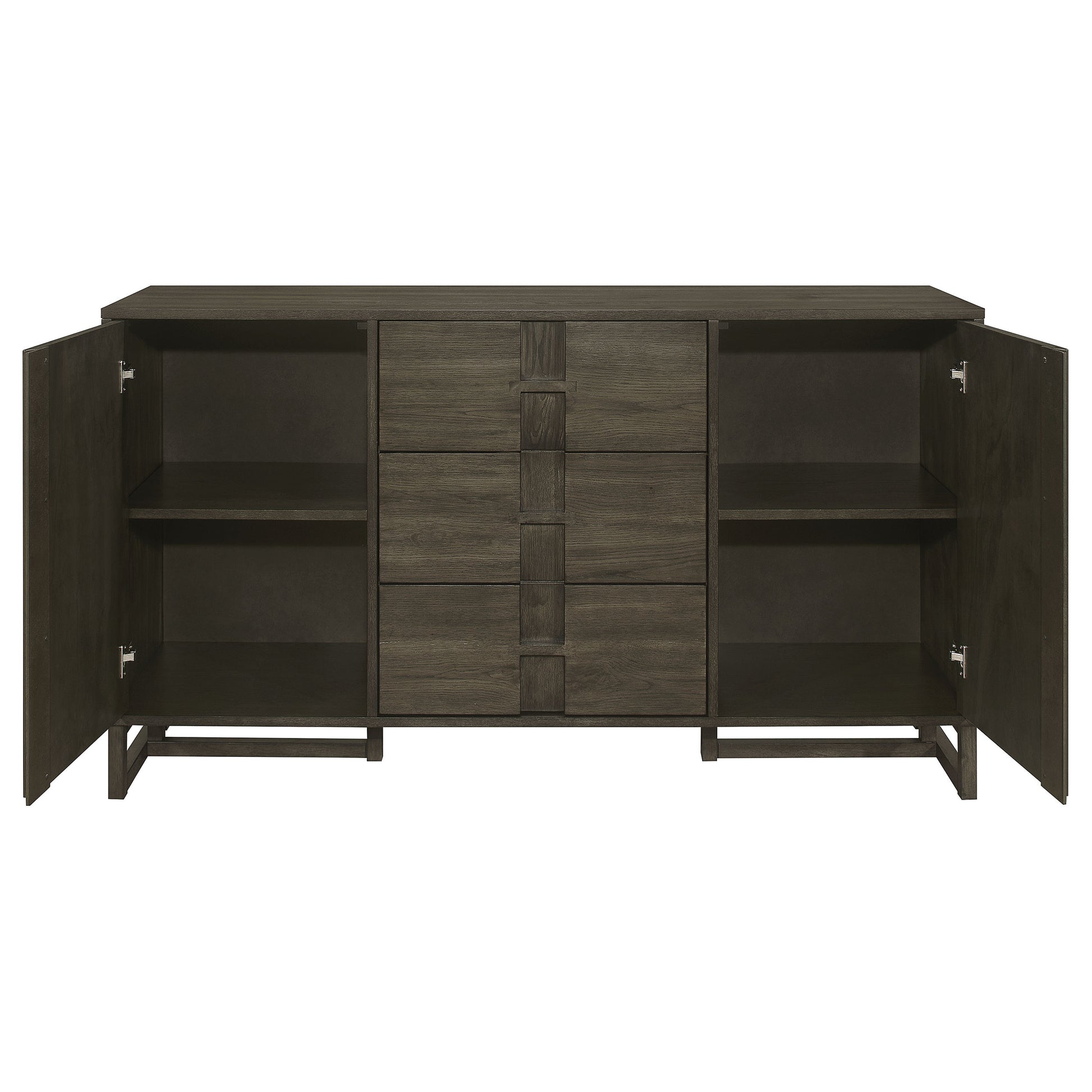 Transform your dining space with our stylish server, designed to enhance both functionality and style. This server features two door cabinets, three drawers, and two shelves, providing ample storage for your dining essentials. The sleek dark grey finish exudes modern elegance, while the brown felt-lined top drawers add a luxurious touch. Elevate your dining experience with this exquisite server, combining practicality and sophistication seamlessly.