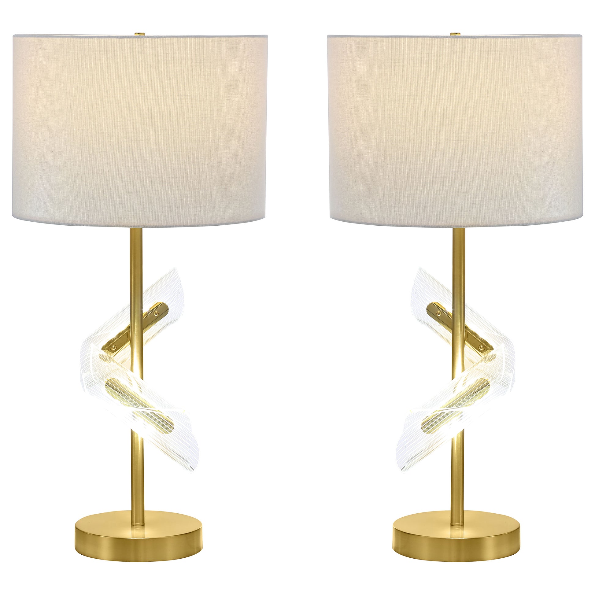 Designed to dazzle, this pair of gold table lamps features a clean drum shade paired with sculptural acrylic accents that wrap around the slender frame. A brilliant LED light glows from within the swirling acrylic, bringing dimension and ambient lighting to the base. The matte gold finish and fabric shade offer modern elegance, making these lamps ideal for nightstands, console tables, or desks in any contemporary setting.