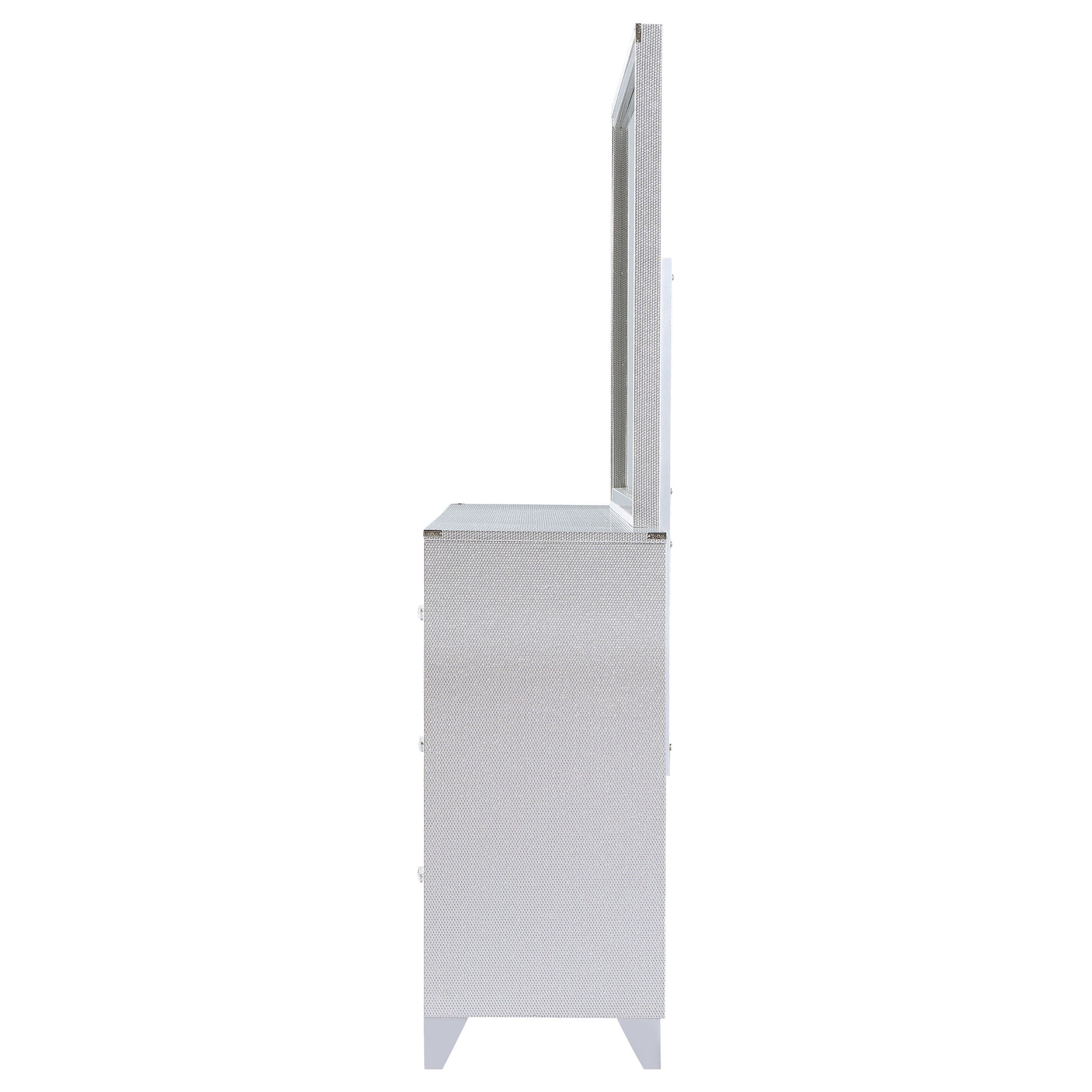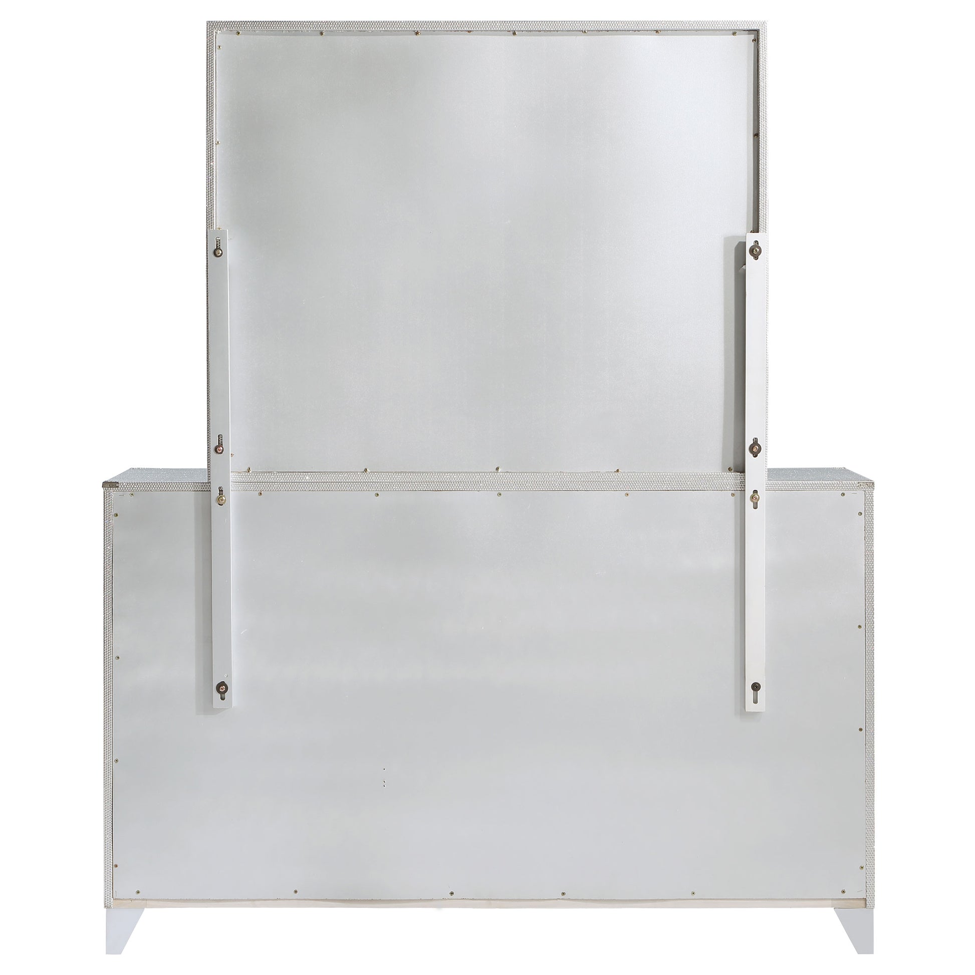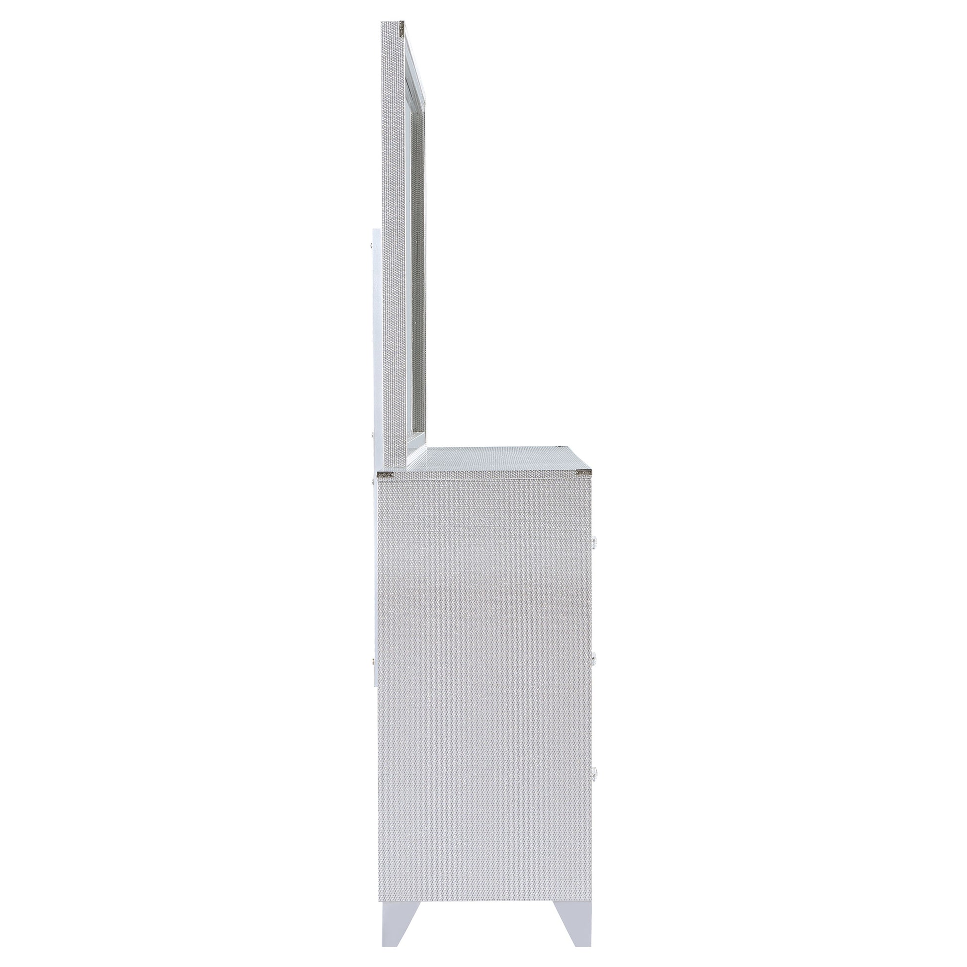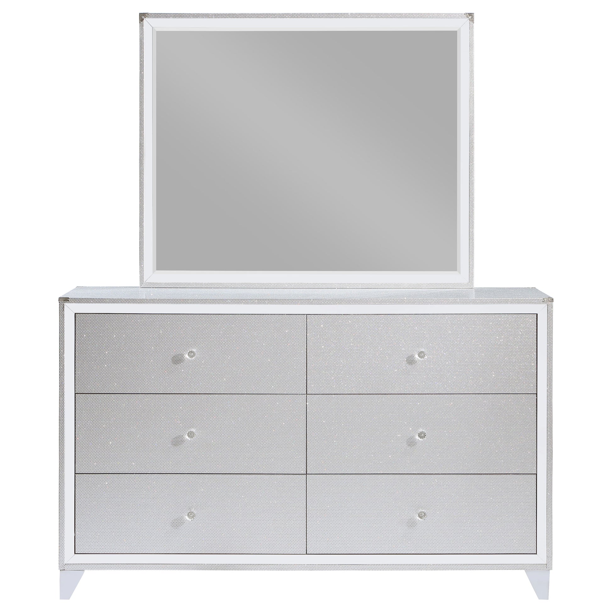 Our 6-drawer dresser and dresser mirror set is a masterful blend of storage efficiency and modern glamour. The dresser is adorned with glimmering accents, mirror trim, and crystal ball pulls, showcasing a modern glam aesthetic that's both functional and sophisticated. It's a statement piece that elevates any living space with elegance. The matching mirror, encased in mirror trim, reflects sophistication and amplifies the glamour, serving as a stunning accent that enriches your bedroom decor with its luxurious allure.