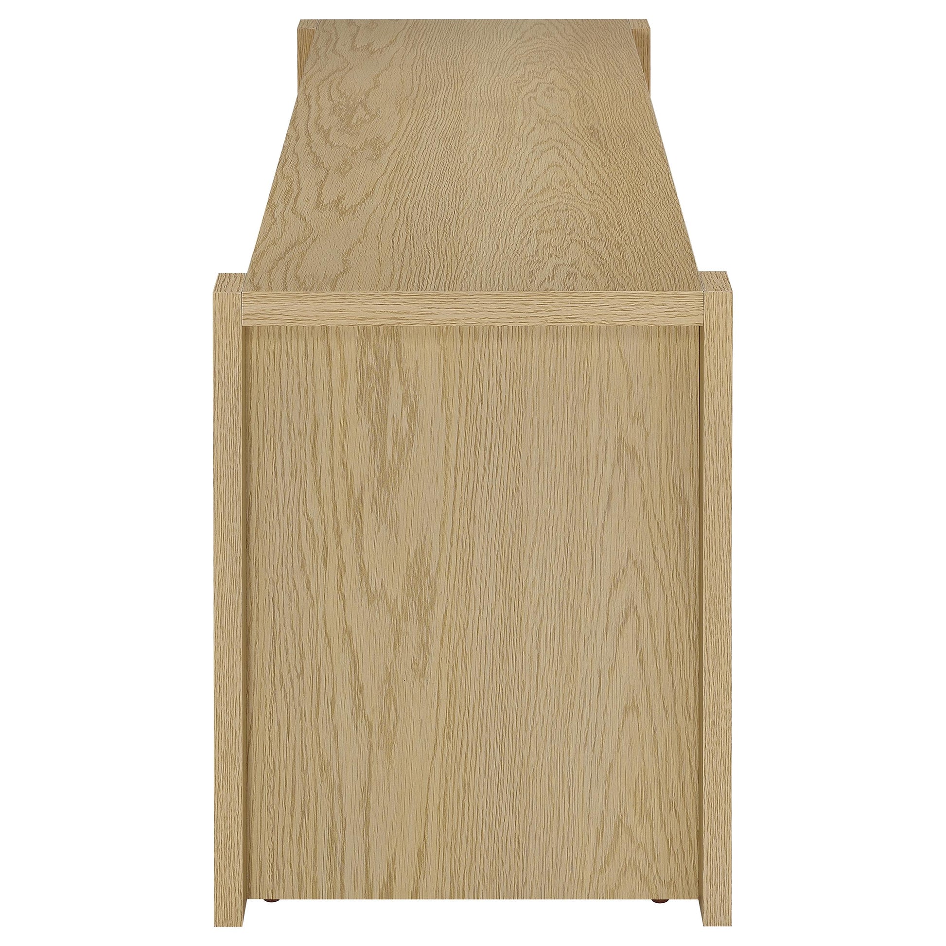 Clean lines and a calming finish define this two-door TV stand, where function meets refined simplicity. The open center shelves are perfect for consoles or display, while each door opens to reveal an adjustable shelf for tailored storage. Discreet cord access at the back keeps your setup neat and clutter-free. Crafted from engineered wood with a scratch-resistant and eco-friendly laminate veneer, its light oak finish brings an airy, organic warmth to your living room or media space.