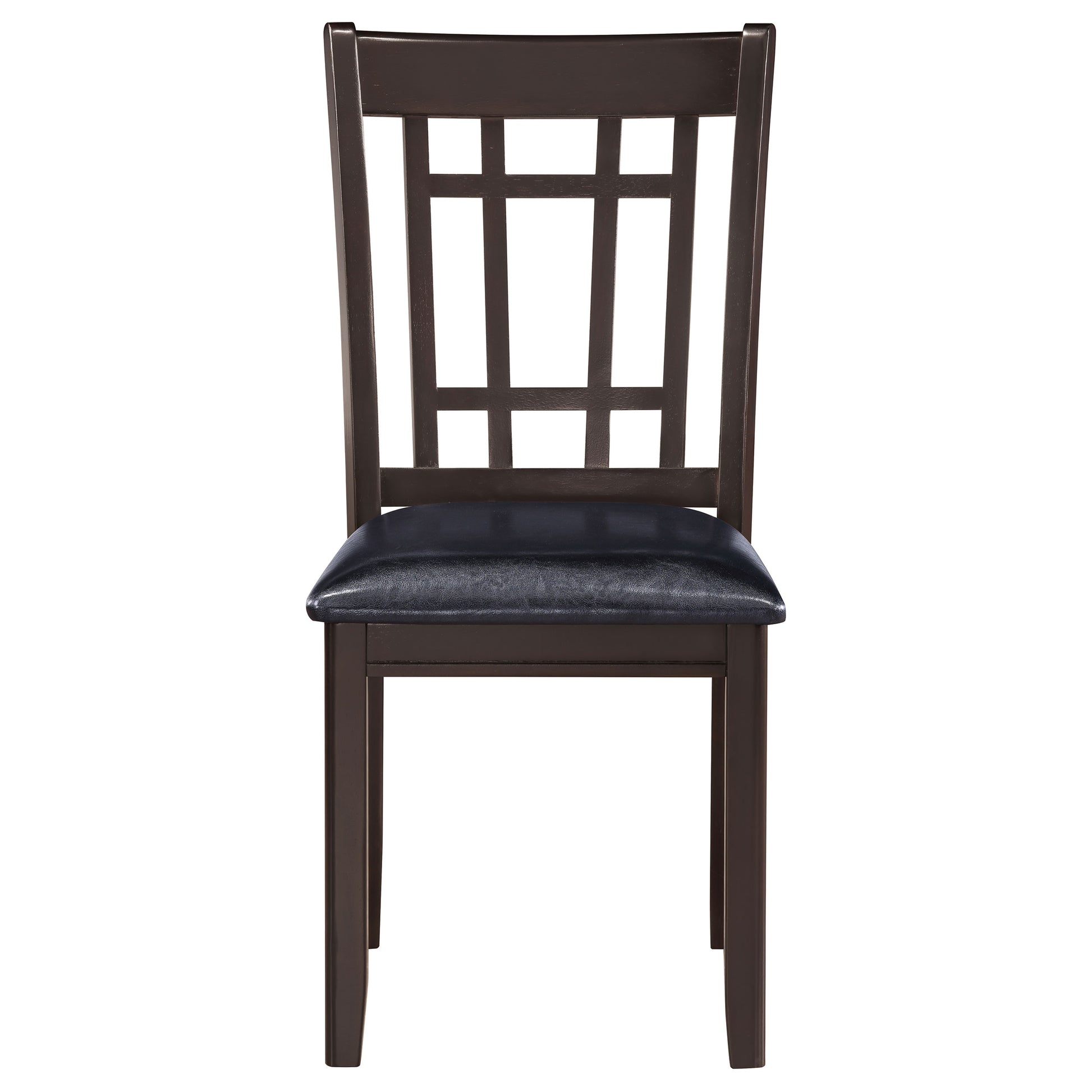Sturdy, functional dining chair is part of the transitional Lavon Collection. Back rest features wood styling in rectangular design. Slightly flared back legs and back rest and with straight front legs enhance a silhouette that's half pragmatic, half eclectic. Rich espresso finish and black leatherette seat are aesthetically pleasing. Consummate complement to matching dining table.