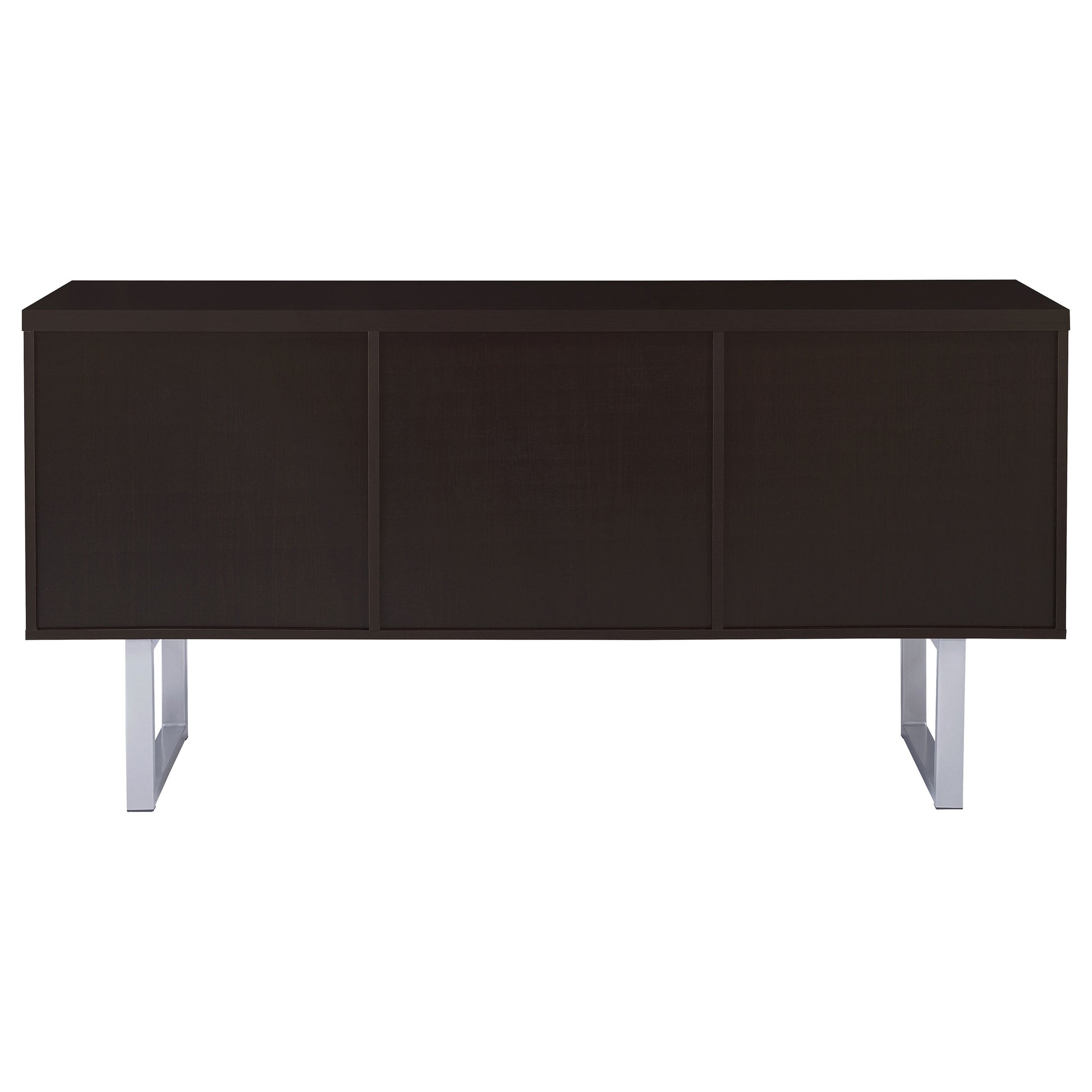 Extend the utility of an office desk with this beautiful credenza. Built with a linear silhouette, its minimalist design is flattering to a contemporary office. Cappuccino brings a dramatic finish. Metal u-shaped legs and hardware add perfect finishing touches. Storage and utility are top-notch with a top drawer, an open shelved compartment. and two file drawers.
