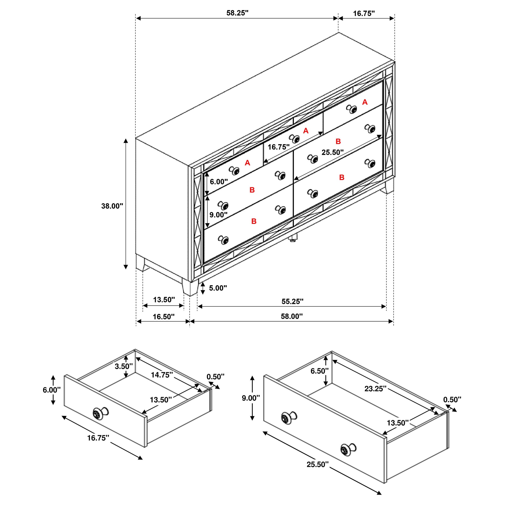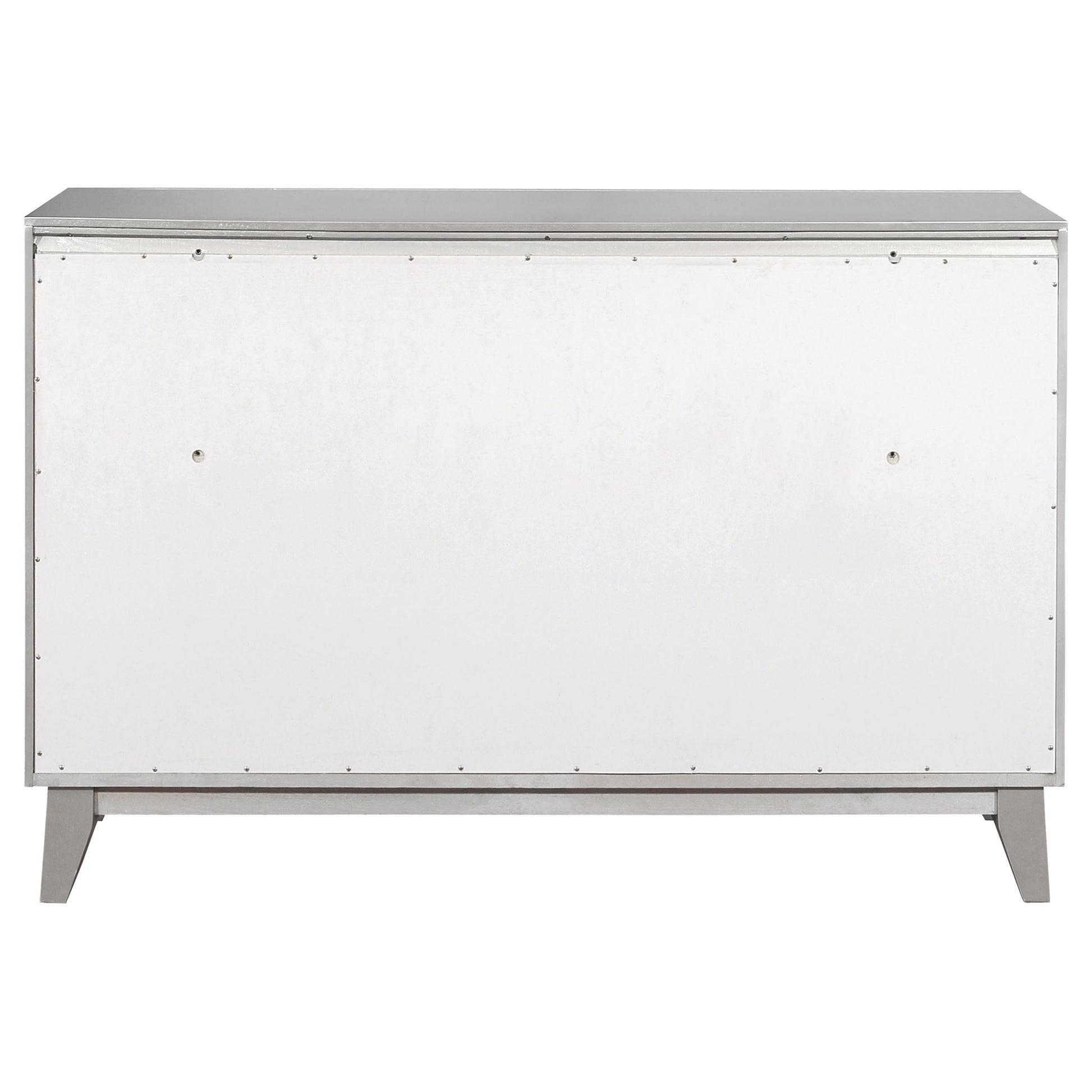 Chic and sparkly, this stunning dresser instantly dresses up a bedroom. A beautiful, metallic mercury finish gives it a lovely, polished look. Its front edges are enhanced by brilliant, reflective accents for a touch of dazzling shine. Spacious drawers allow plenty of space to store clothing and accessories. A Coaster exclusive, this dresser exudes transitional glamour.