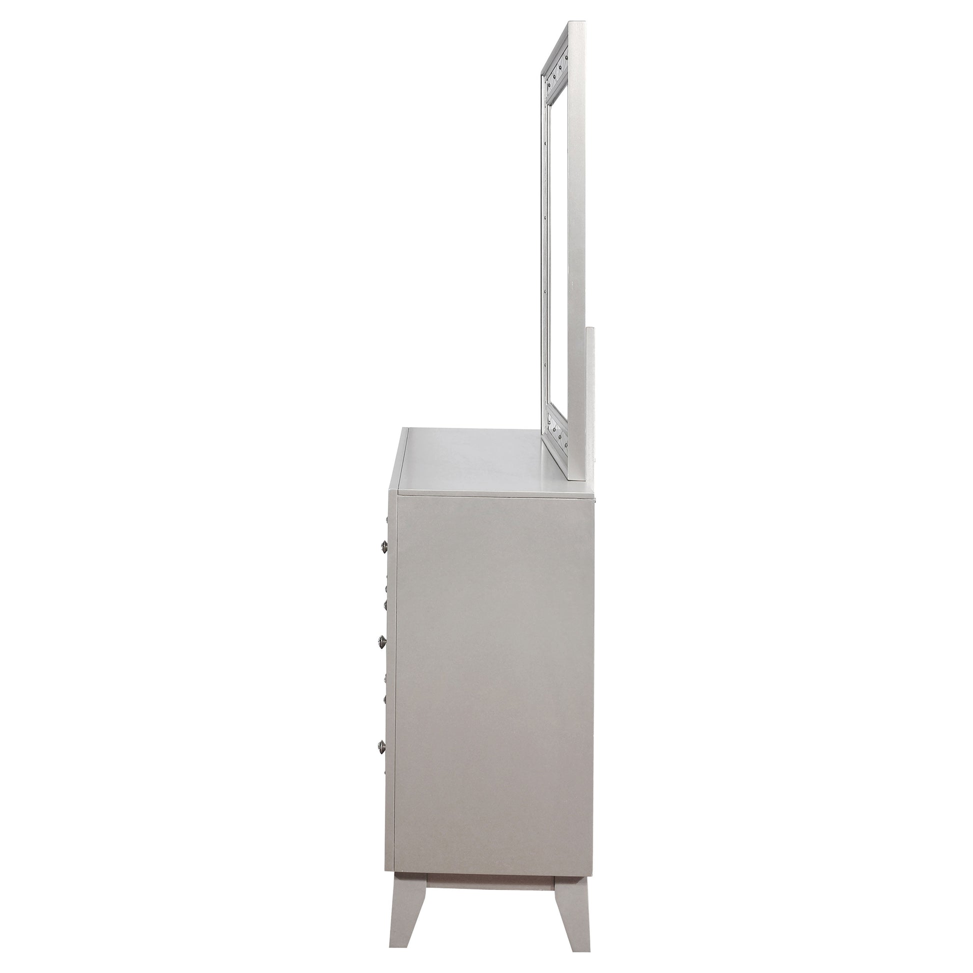 Elevate your bedroom's style with this chic and sparkly dresser and its stunning mirror. The dresser's metallic mercury finish and reflective accents provide a polished and dazzling shine. Its spacious drawers offer ample storage for clothing and accessories. The transitional mirror, with its etched mirror panels and metallic mercury finish, radiates chic light, adding a luxurious touch. Its angled corners and embossed mirrored glass create an elevated, stylish look, perfect for enhancing your dressing routine.