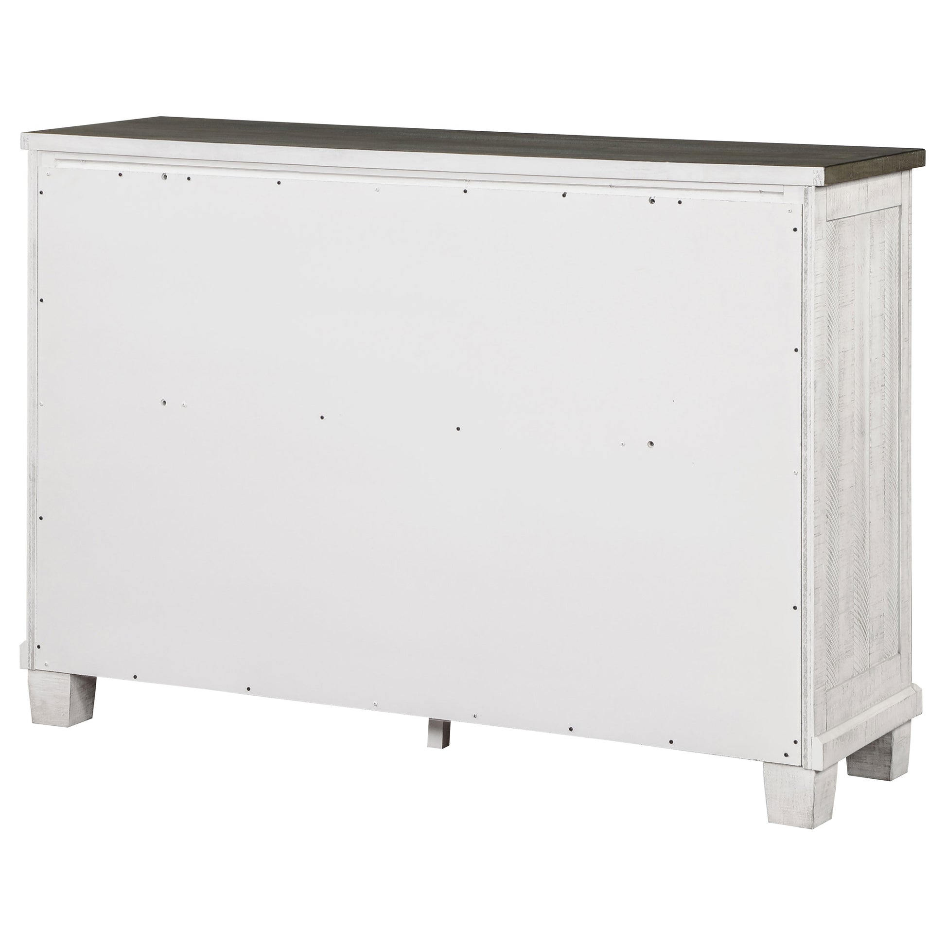 Introduce ample storage and rustic style to your bedroom with a seven-drawer dresser. Three upper drawers are ideal for smaller items and delicates, while four lower drawers beneath create space for jeans, sweaters and more. The dresser shows off a lightly distressed white finish, paired with a contrasting gray top that creates depth and contrast. Hexagonal bolt heads augment the front of the drawer case, and each drawer front is complete with a classic curved handle for easy operation. The dresser is designed with metal extension glides for smooth performance, and offers English dovetail joinery for lasting durability.
