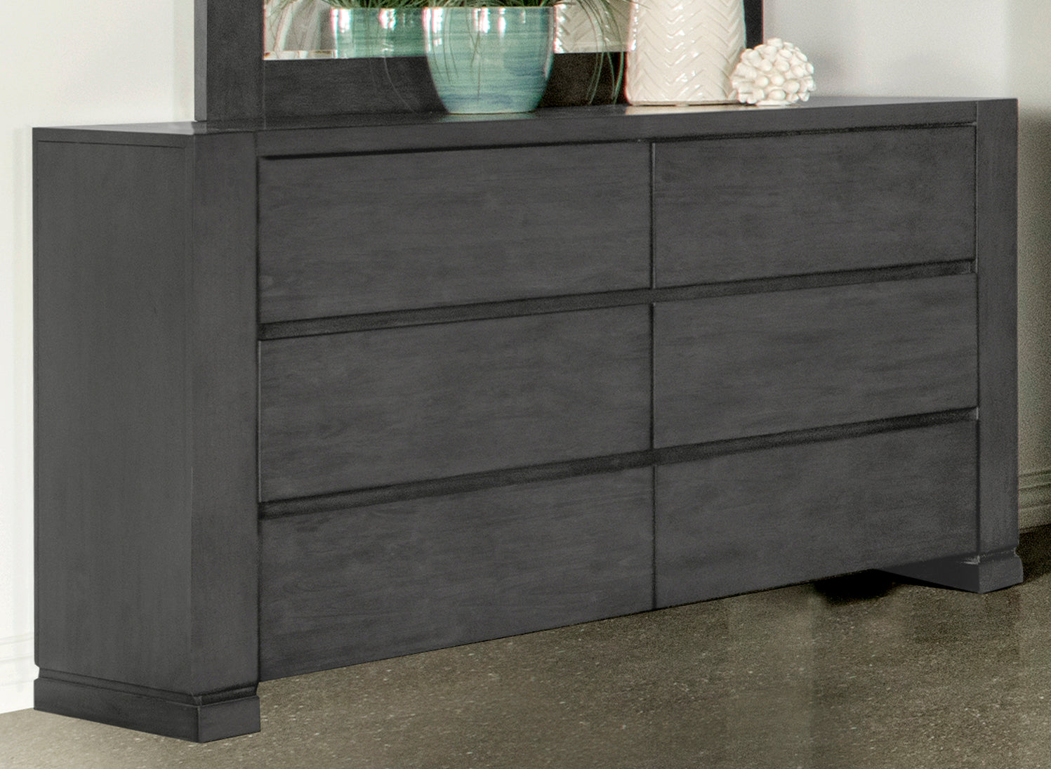 Play up the easy-living simplicity angle of this modern wood dresser, a perfect venue for clothing and linen storage in a contemporary bedroom. Admire the straightforward design employing clean, simple linear principles. A cool dark gray finish coats sustainable hardwood from rubberwood plantation lumber. Drawers slide easily on metal glides, with its top drawers adding protection through flannel lining. This dresser becomes a key piece in a bedroom ensemble that lasts through successive redesign projects.