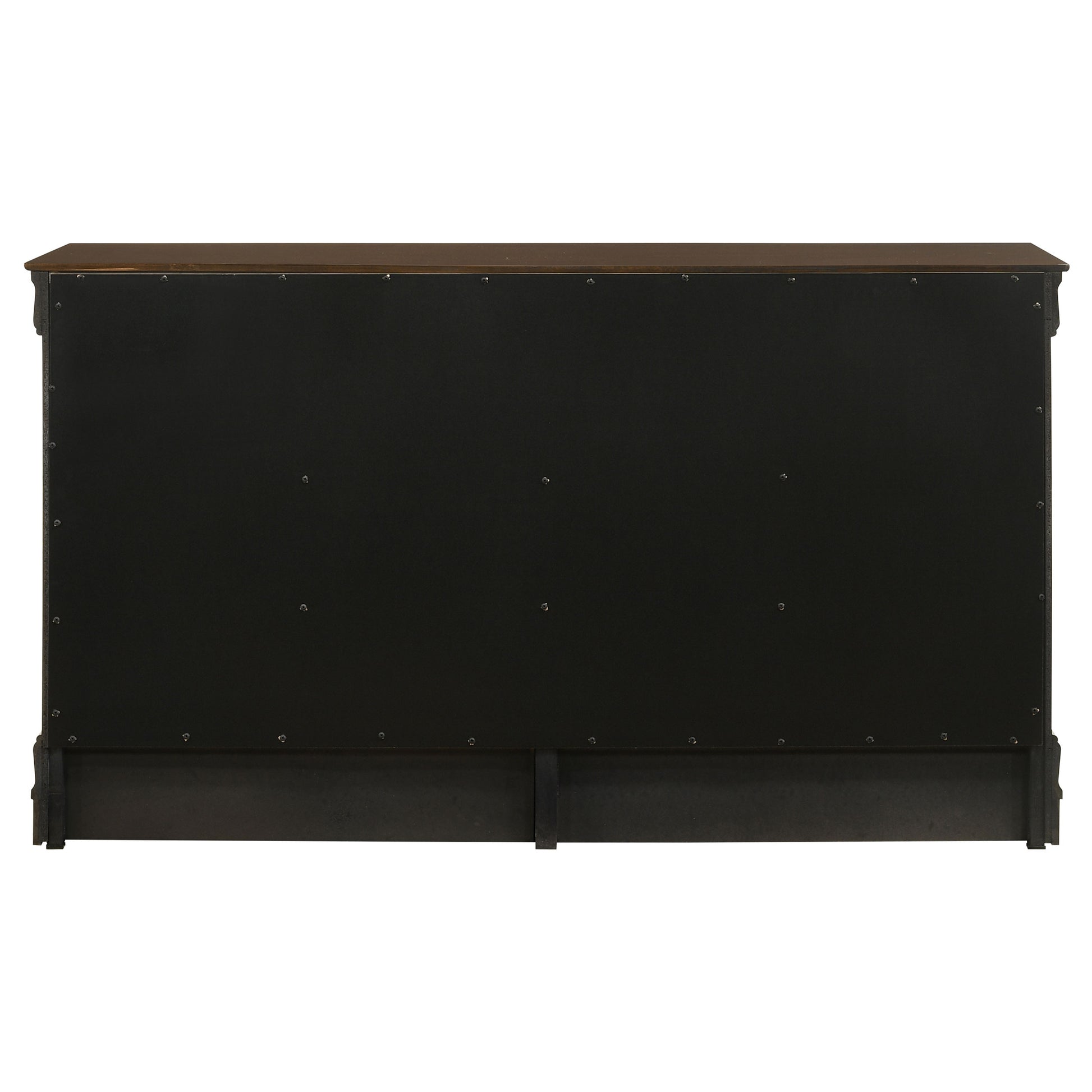 Polish up a traditional decor scheme with this six-drawer dresser, featuring simple and elongated details. Add extra dimension with an exposed wood grain in a warm cappuccino finish. Sleek and simple, radiate classic style and sophistication with the contrast between the deep hue of the wood and nickel bail drawer handles. Crafted from wood veneer and select hardwoods, the silhouette highlights a slightly exposed wood grain. Store clothes in style with the dovetail drawer construction.