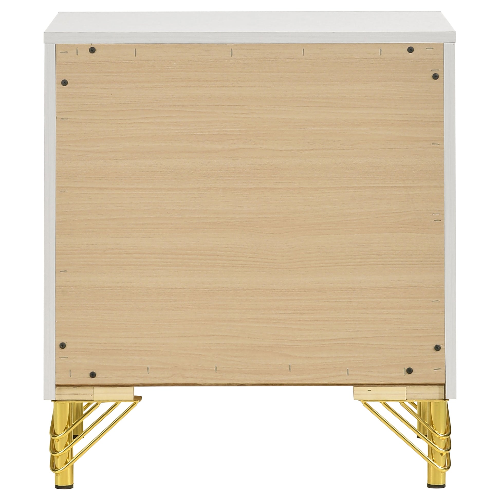 Gleaming gold trim captures attention on a modern two-drawer nightstand. Perfect for your sophisticated bedside, it boasts a bright white finish case that offers the perfect touch of depth with its gold trim. A pair of long bar pulls decorate drawer fronts. Hairpin style legs offer vintage flair and exceptional elegance. Two drawers add plentiful bedside storage, offering a place to ruck away personal items and overnight essentials.