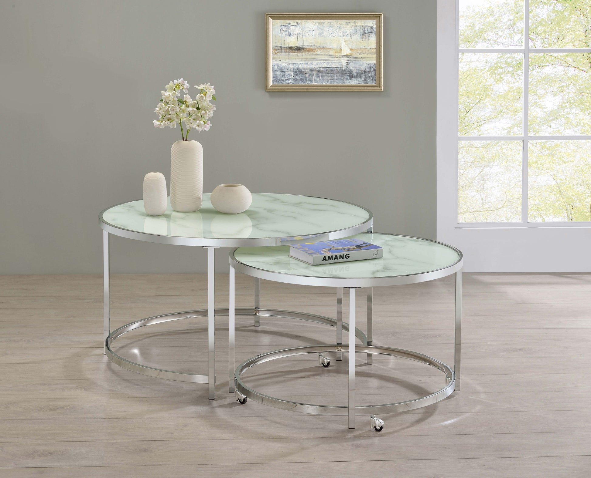 Soften a seating area with this round two-piece nesting table set. Designed with a Carrara marble-printed tempered glass tabletop, each table offers a classic, traditional touch. Surrounded by a slim metal banding in a gleaming chrome finish, each nesting table lends a modern flair. The metal banding continues downward into sleek legs. Convenient and versatile, the smaller nesting table is also equipped with mobile casters, allowing you glide it out easily.
