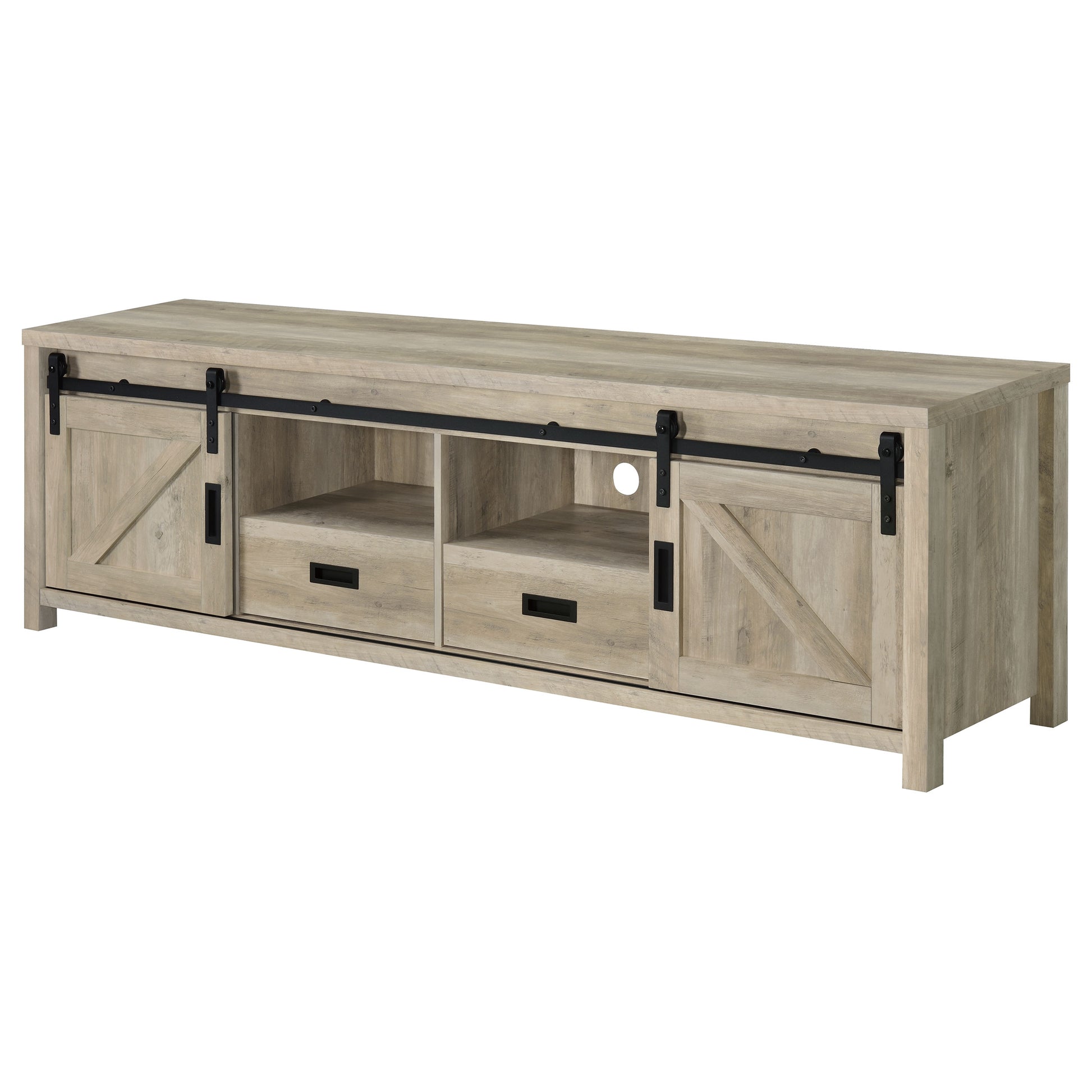 Wood-like finishes and country-inspired elements create this rustic style TV console. Keep entertainment consoles, a stereo and more tucked neatly within two open shelves toward the center. Disguised by sliding barn doors mounted on black hardware that lend an industrial touch, this television console also stores away entire collections of movies, games and music. With its long rectangular design and clean square edges, this console furniture piece makes an excellent addition to entertainment rooms and living rooms. This TV console makes a charming, versatile piece for your entire entertainment system setup.