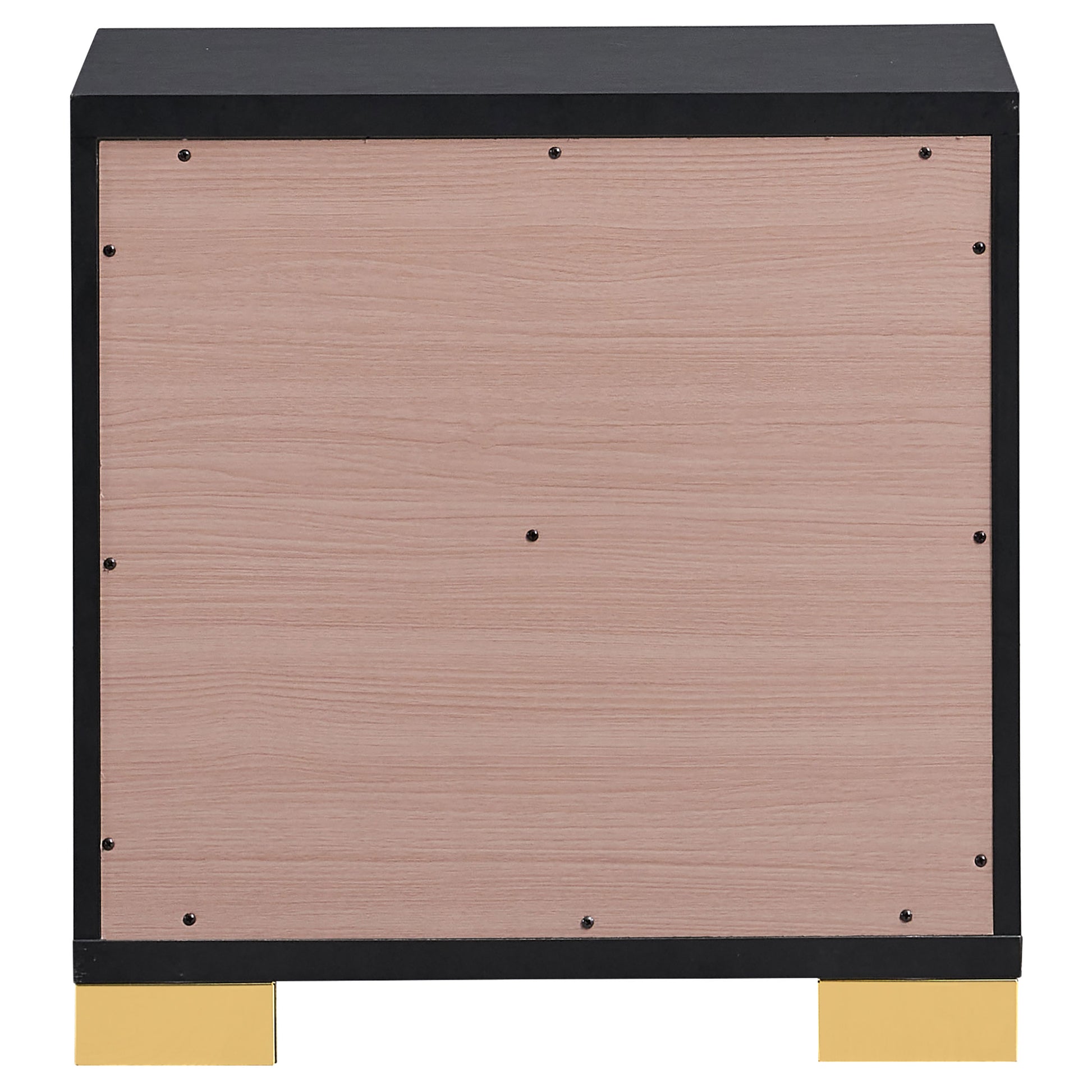 A bold look leans exotic and alluring to transform your master or guest bedroom into an inviting venue. Modern design details produce a chic nightstand with an Art Deco vibe and tons of elegance. Made of wood products, this two-drawer nightstand features a versatile finish with accenting from gold finish metal, placed carefully to emphasize a geometric linear effect. Store incidentals and accessories in two drawers operating smoothly on center metal glides. English dovetail drawer construction embellishes this nightstand’s quality, as vertical gold metal hardware offers a unique impact.