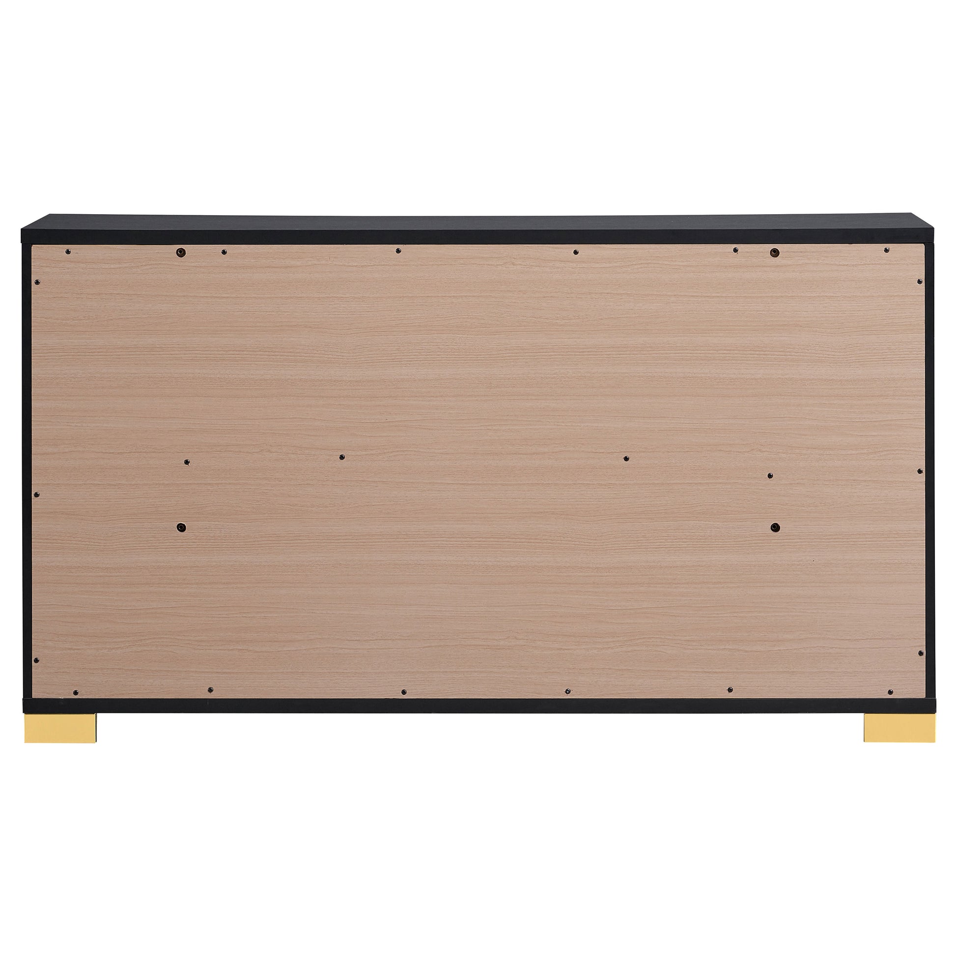 Soak up the sleek and simple yet compelling look of a six-drawer dresser with a dramatic aesthetic that changes the tone of your contemporary bedroom. Modern design details produce a chic vertical dresser with an Art Deco vibe and tons of storage space. Made of wood products, this six-drawer dresser features a versatile finish with glam accenting from gold finish metal, placed carefully to emphasize a geometric linear effect. Store incidentals and accessories in drawers operating smoothly on center metal glides. English dovetail drawer construction embellishes this dresser’s quality, as vertical gold metal drawer hardware offers a unique impact.
