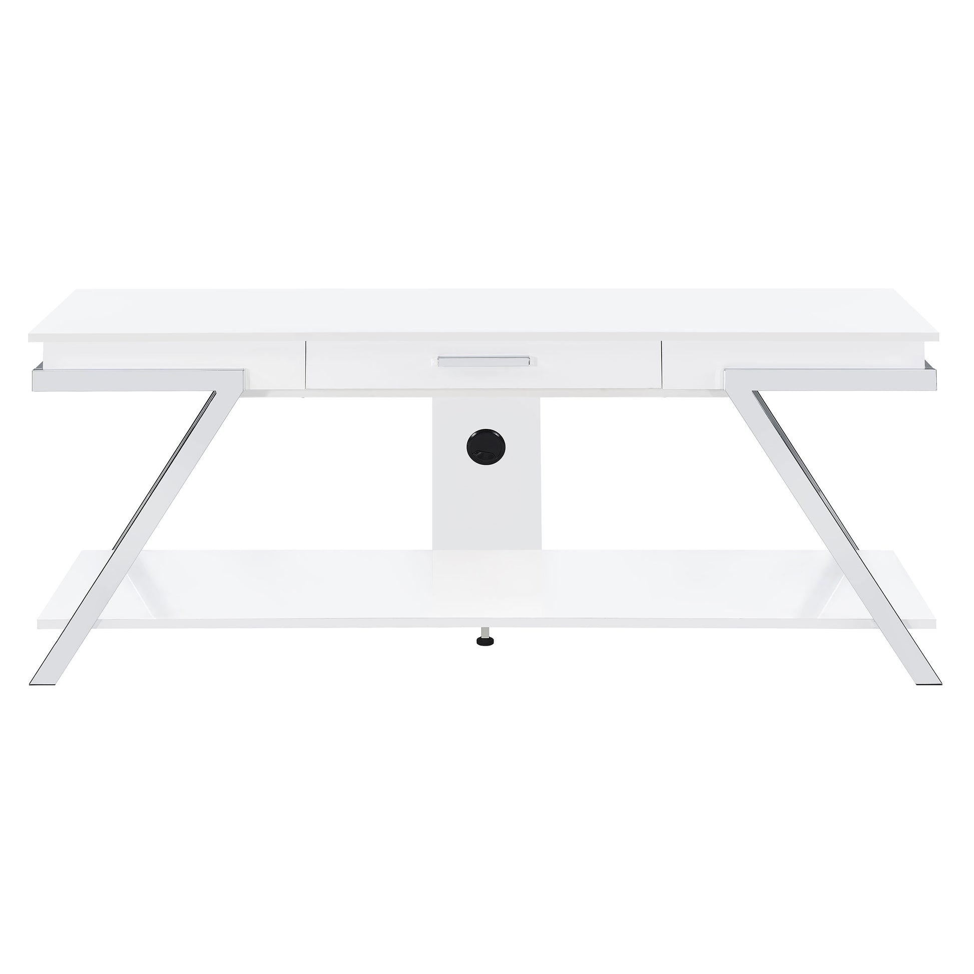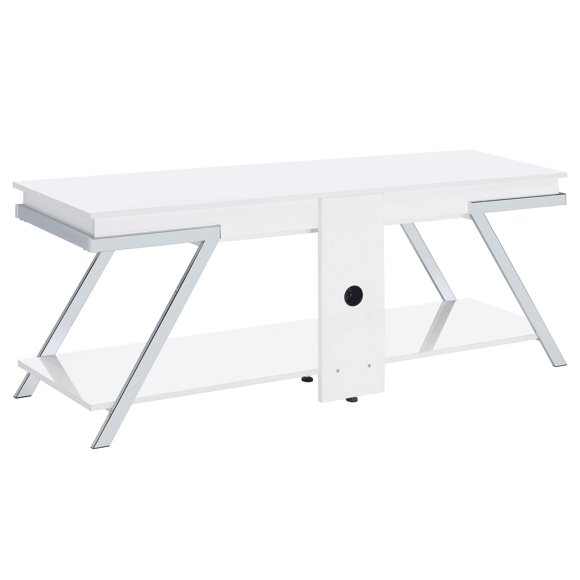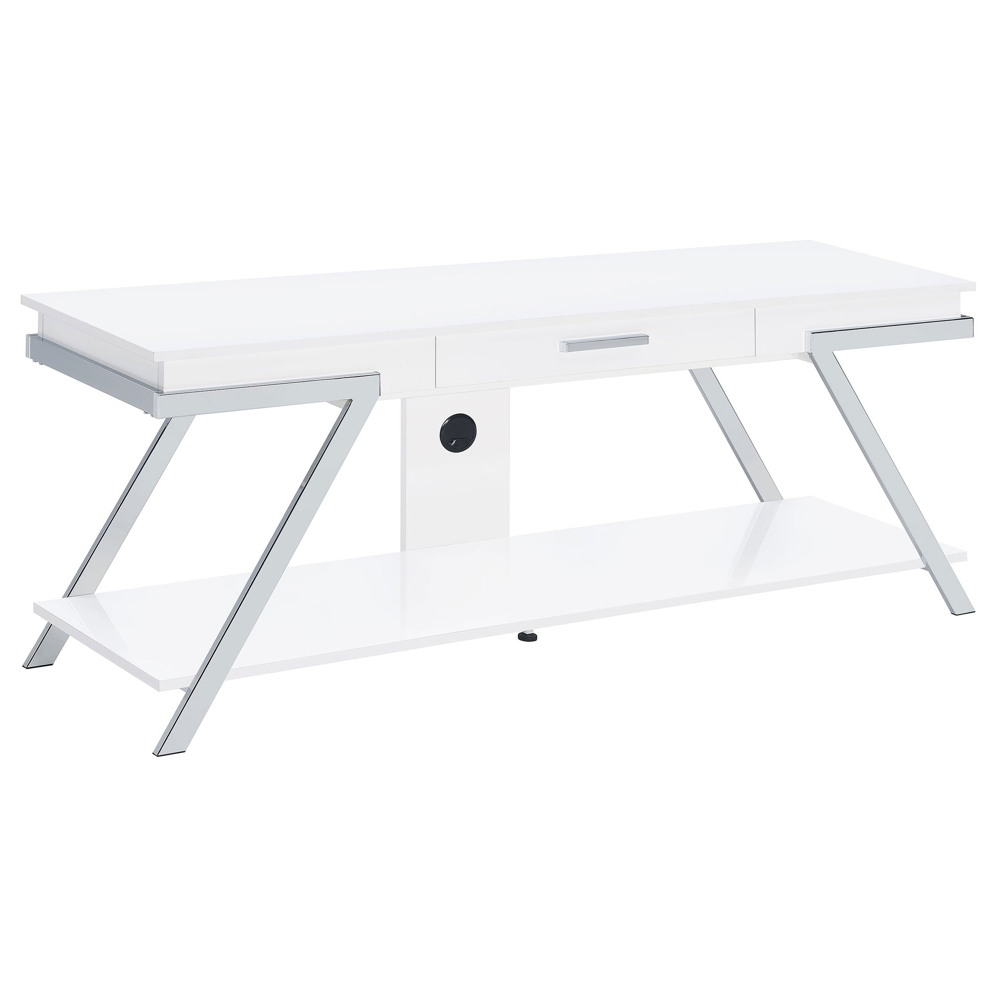 Fresh, inspired design turns your casual home into a haven for easy style with a novel design in a TV stand. Prep a media or entertainment room with this ultra-contemporary TV stand made of white high gloss finished MDF with paper coating. Angular metal framing adds a cool aesthetic boost. A modular-like configuration and aesthetic works well in updated casual rooms, with a spacious upper surface and lower shelf. A single center drawer stashes incidentals.