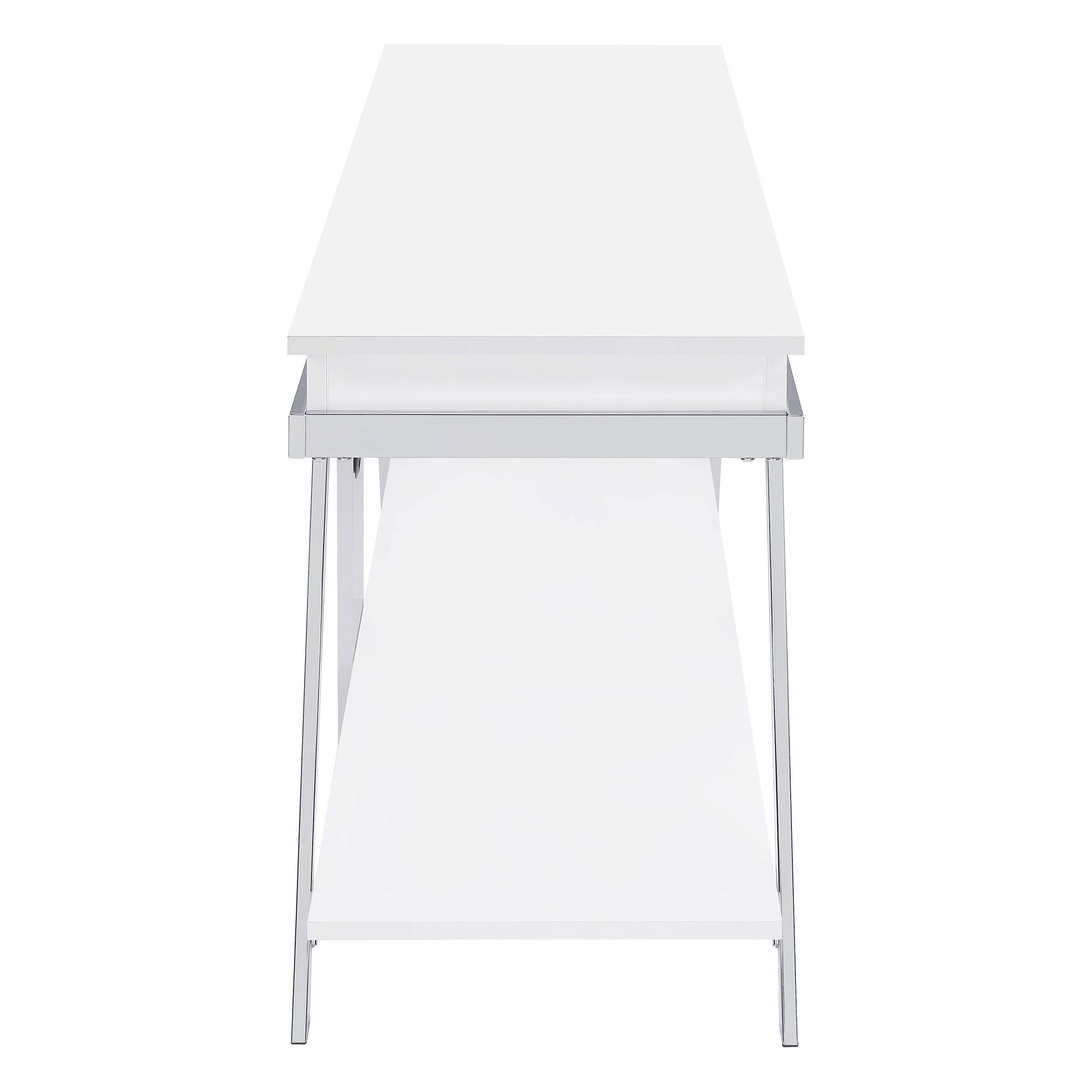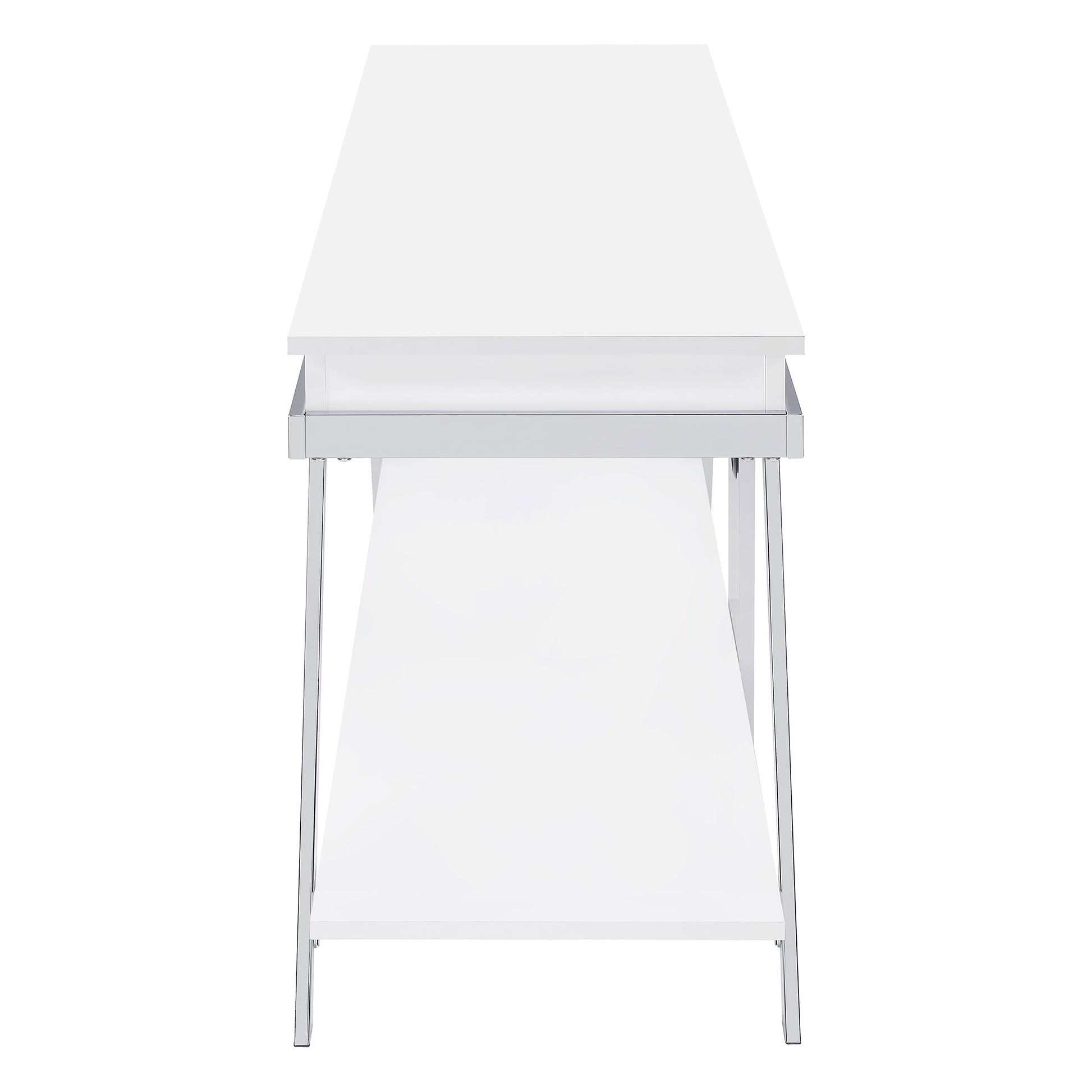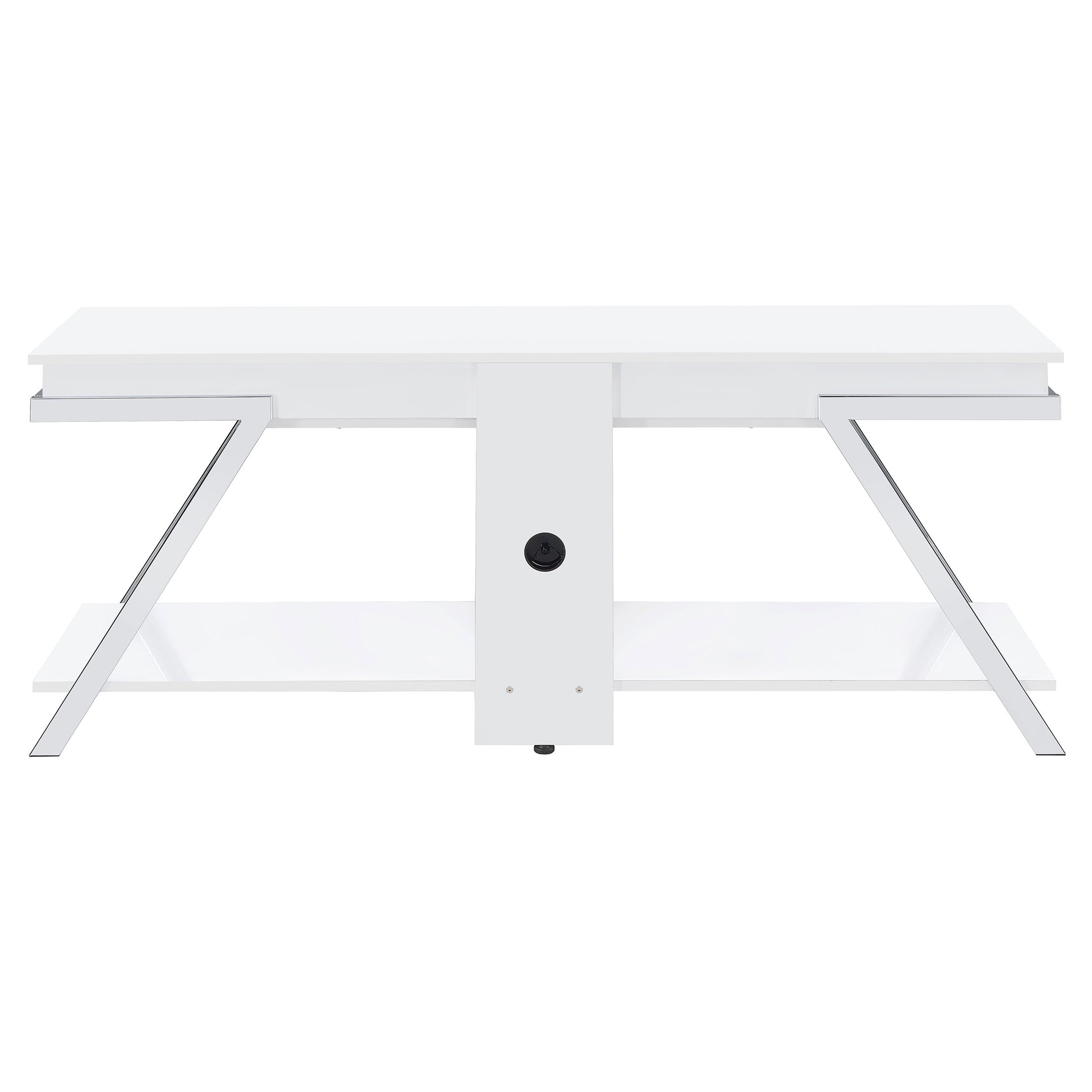 Fresh, inspired design turns your casual home into a haven for easy style with a novel design in a TV stand. Prep a media or entertainment room with this ultra-contemporary TV stand made of white high gloss finished MDF with paper coating. Angular metal framing adds a cool aesthetic boost. A modular-like configuration and aesthetic works well in updated casual rooms, with a spacious upper surface and lower shelf. A single center drawer stashes incidentals.