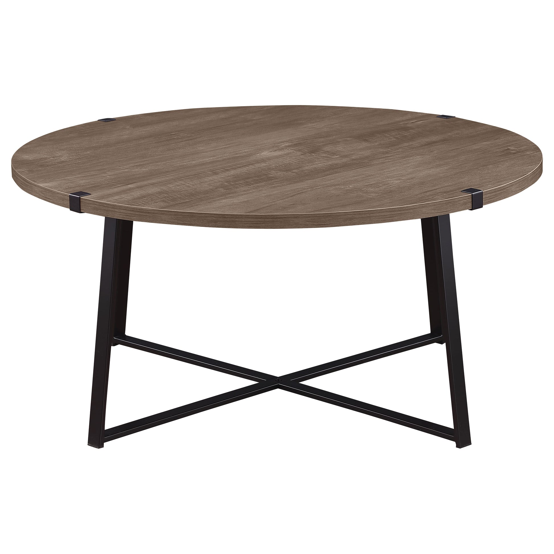 Create a cohesive and stylish living space with this modern coffee table set, designed for both form and function. Featuring engineered wood tops in a warm light brown finish, the set highlights natural wood grain textures for an inviting aesthetic. Each piece rests on a sturdy black powder-coated metal base with intersecting supports for stability. Bracket accents at the edges lend a touch of industrial character. The scratch-resistant laminate veneer ensures durability, making this set perfect for busy living areas.