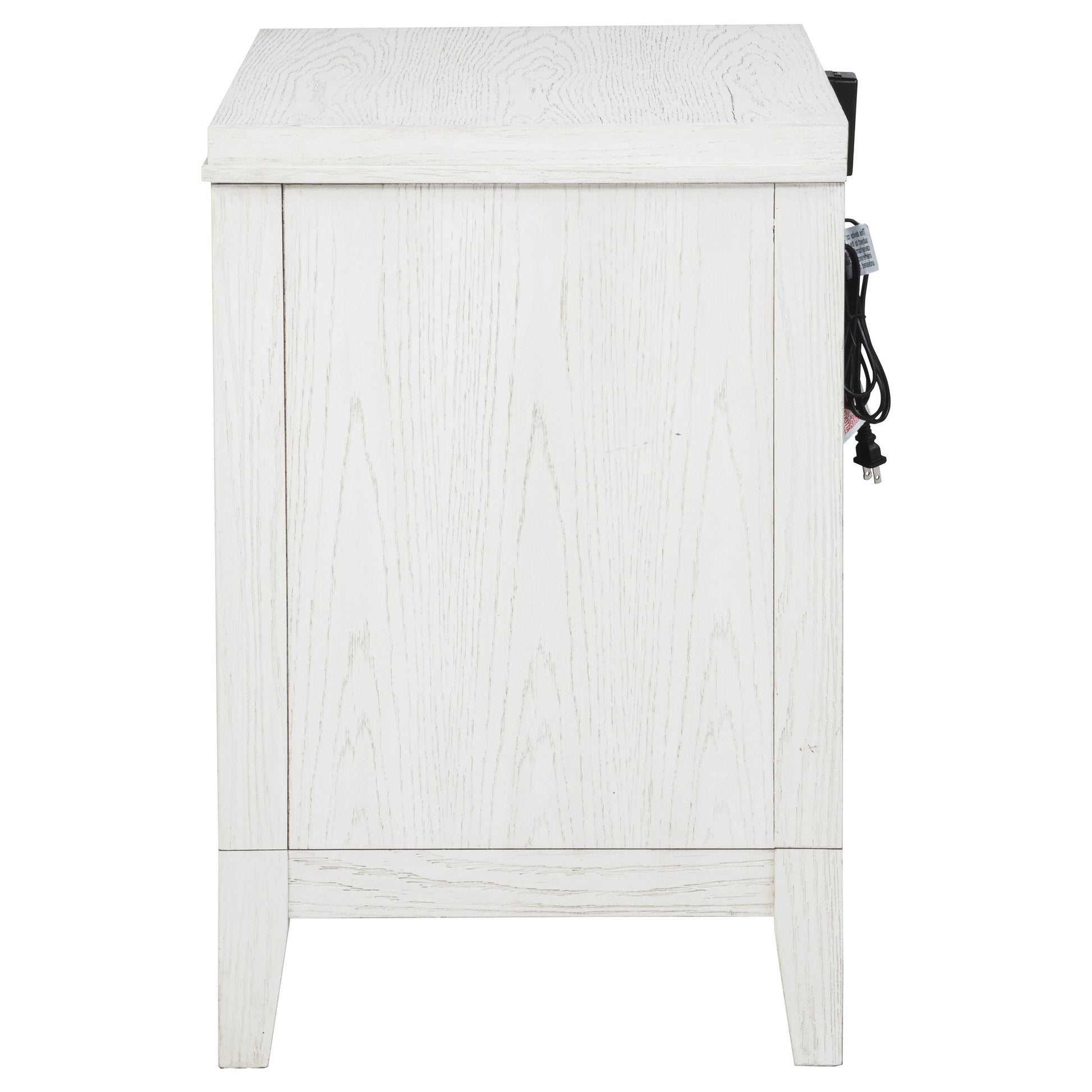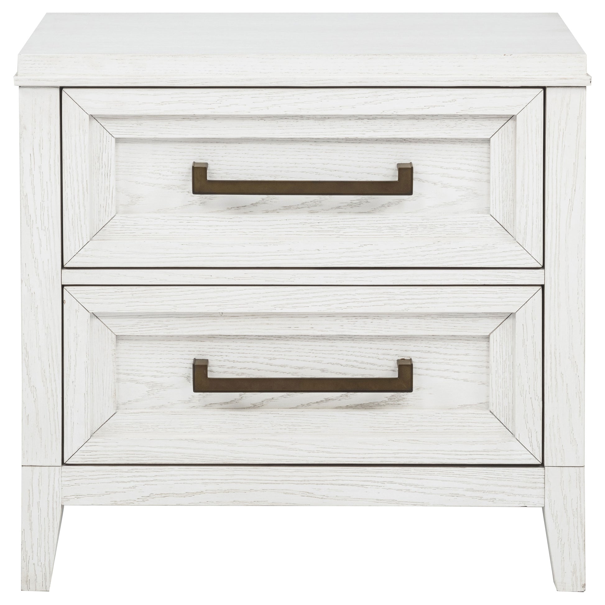 Bring fresh perspective to your bedside with a modern two-drawer nightstand. Its casual style and classic stance create a restrained look and feel, perfect for a soothing bedroom space. It features a distressed white finish over wood grain, creating subtle depth and detail. Drawers are roomy for bedside essentials, and stepped fronts add character and dimensionality. Contrasting antique brass toned bar pull complete the look, offering stylish allure in your stylish bedroom.