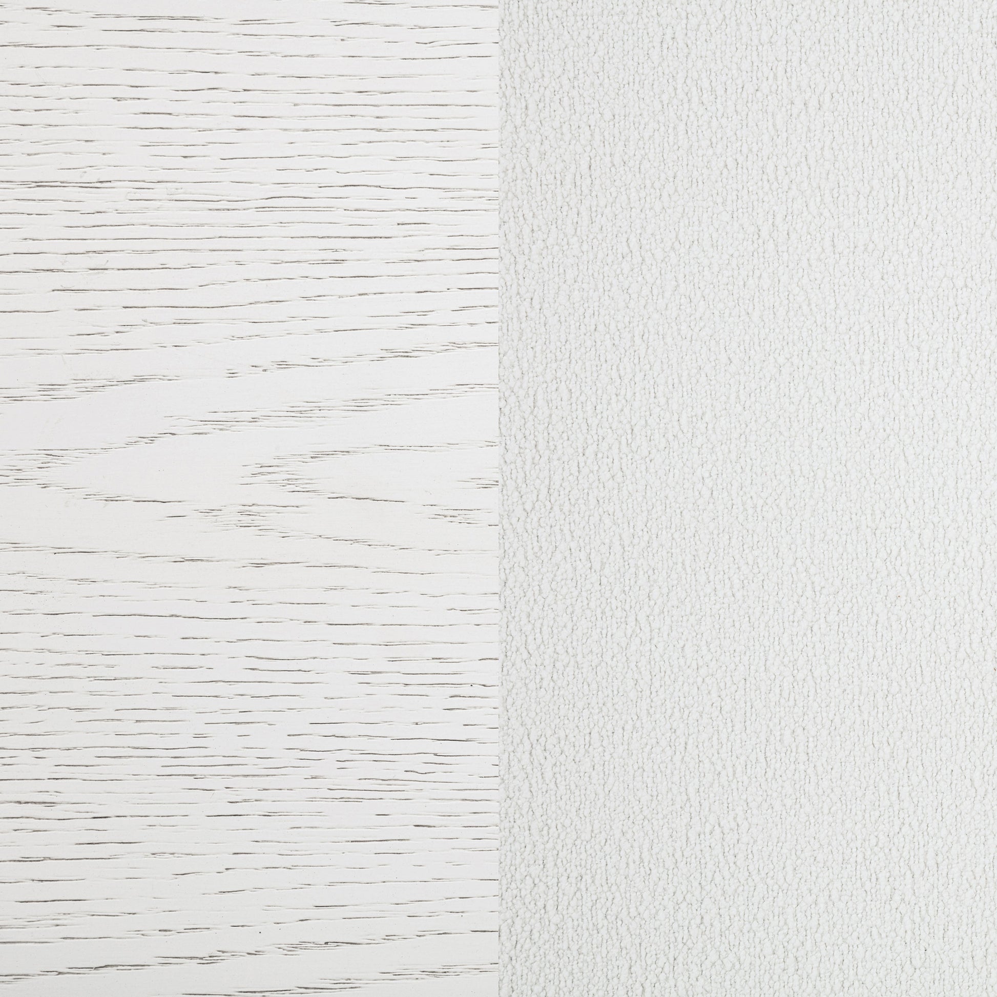 Distinctive hardware and layered trim work create a refined but dimensional effect for a five-piece modern bedroom set. In distressed white with wood grain texturing, it's a complete set that includes an upholstered bed with a padded headboard, two-drawer nightstand, five-drawer chest, and six-drawer dresser and mirror. It delivers ample storage and easy organization in a cohesive bedroom ensemble. The bed features a contemporary, open silhouette with a tall headboard and low footboard. Add colorful linens for a fresh look or stick with crisp white for a soothing monochromatic effect.