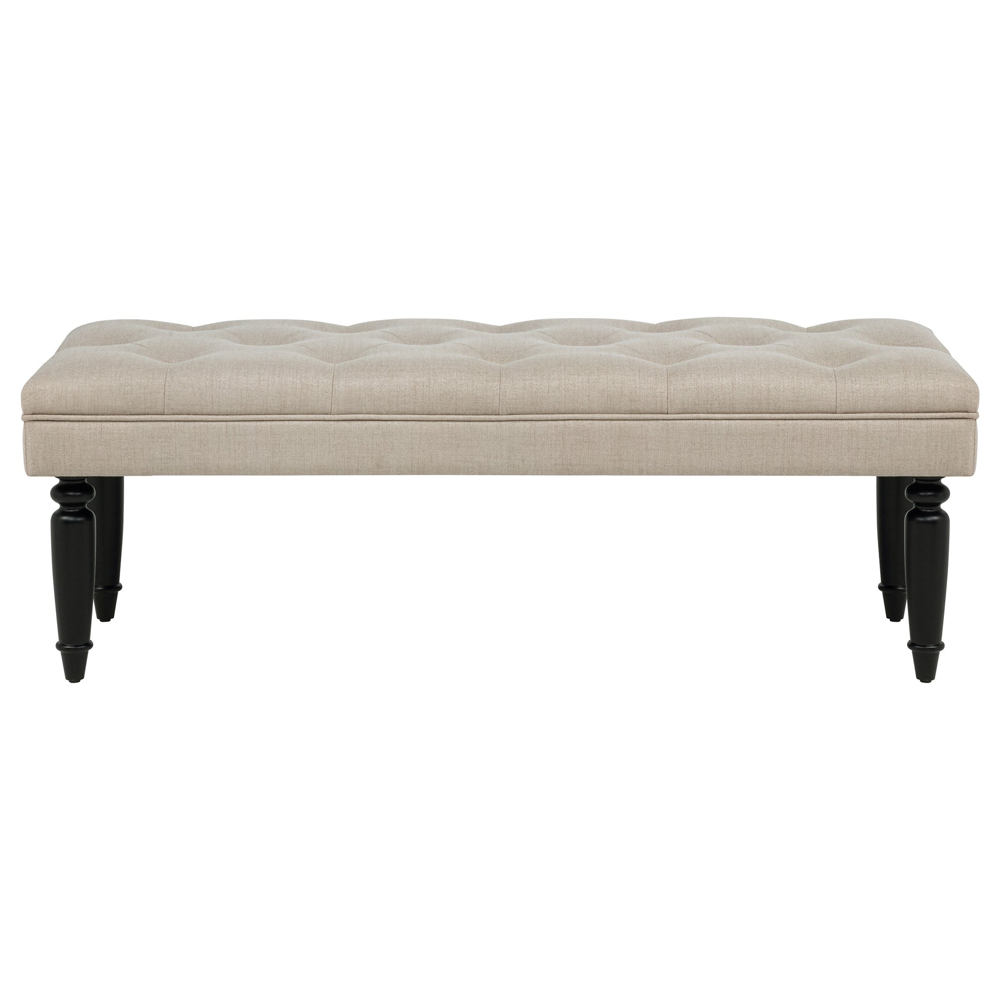 Traditional grace meets modern versatility in this upholstered accent bench. A softly tailored seat with button tufting lends texture and charm, while turned wooden legs offer a grounded elegance. The elongated frame invites moments of pause at the foot of a bed, beside an entryway, or in a quiet corner. With plush cushioning and a gently refined silhouette, this bench blends function and romance for curated spaces that value comfort and form.