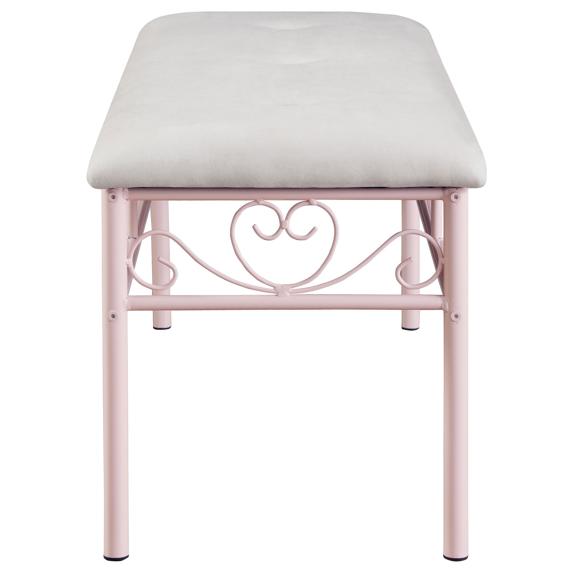 Make a teen’s or child’s bedroom functional and fashionable with this lovely pink padded bench. Enjoy a romantic silhouette combining linear and curved elements with tender, ornate accents. Steel construction offers durability in a bench with a powder pink finish. Topped with a generously padded cushion covered in white fabric, it delivers extra utility for seating or storage. Bring a sweet look to a traditional bedroom group with this charming bench.