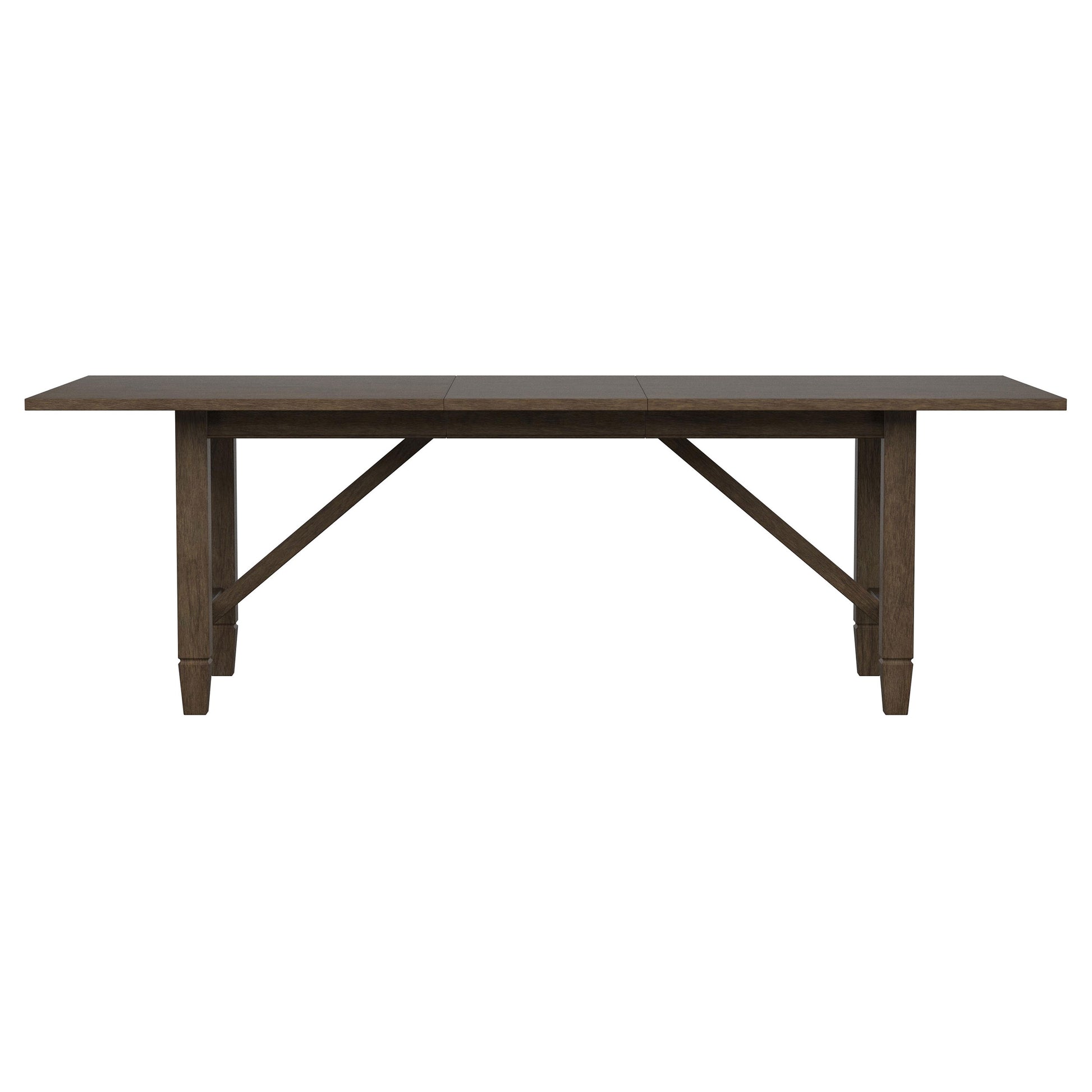 Create a soothing, relaxed ambiance in your welcoming dining room with a transitional five-piece dining set. The set centers on a rectangular table crafted in rubberwoods and graced with a warm, neutral brown finish. Angular support details add trestle-inspired style for a hint of farmhouse flair to the table, which includes an extension leaf for guests. Four side chairs are included, each boasting a matching wooden frame with a plush padded seat in neutral beige upholstery. Rectangular seat backs add rattan, bringing airy appeal and casual character in a kitchen or dining room.
