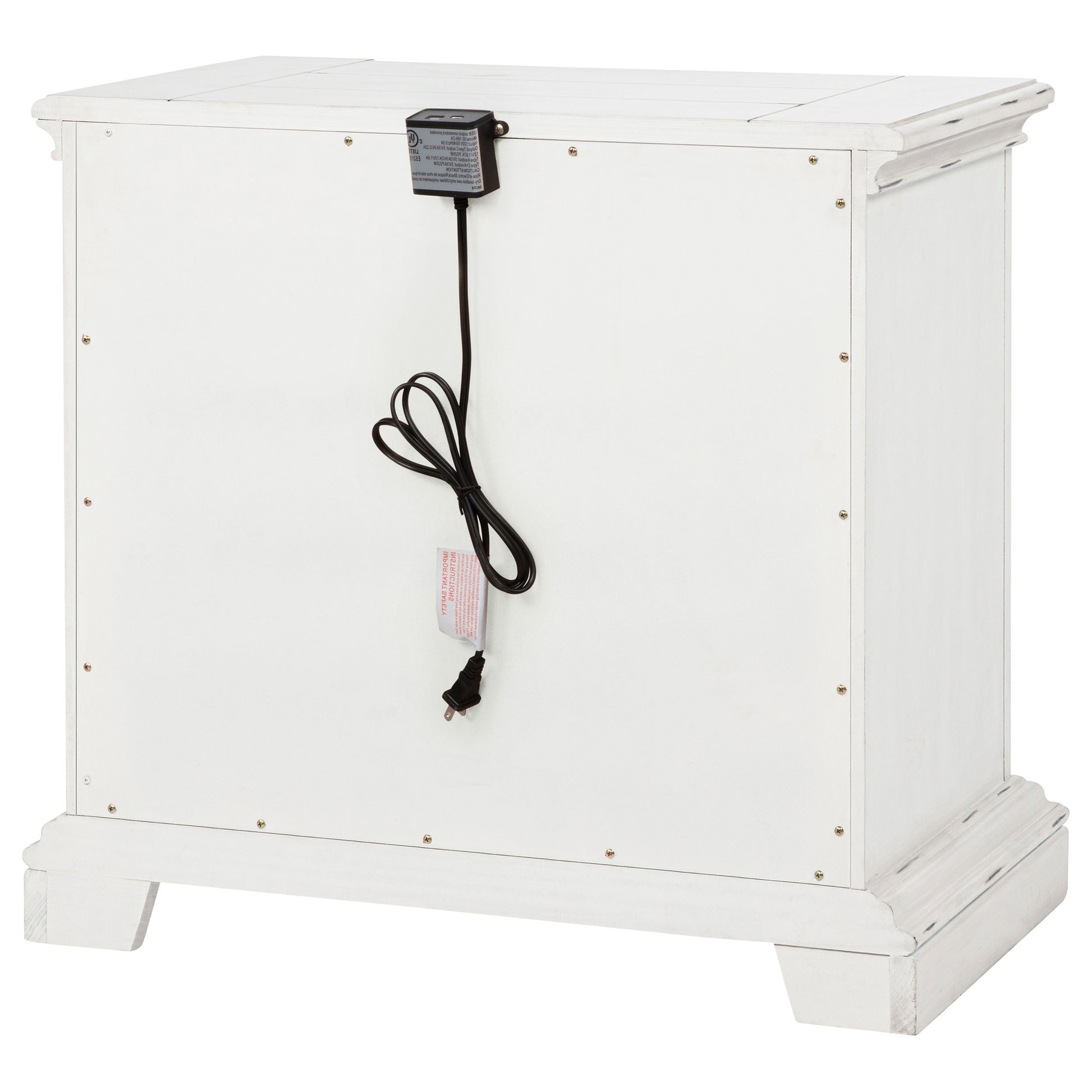 Charming and functional, this two-drawer nightstand blends classic design with thoughtful details. A vintage white finish softens the ornate carvings and sculpted base, while antique bronze handles bring graceful contrast. Dual USB ports are hidden at the back for modern convenience, while felt-lined drawers offer protected storage. Built from poplar and engineered wood, it balances timeless beauty with everyday function.