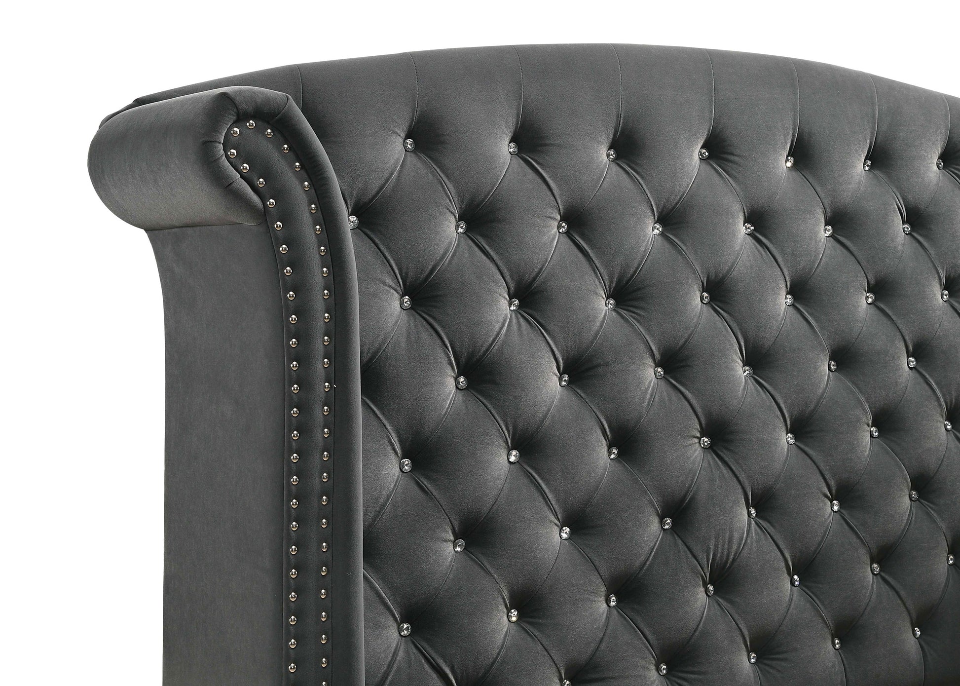Accent your sleeping space like never before with this five-piece bedroom set. A dramatically large wingback headboard towers over the bed to make a grand display, featuring button tufting and nail head trim. A matching dresser comes equipped with six spacious drawers with nail head trim around the frame, coordinating with the matching mirror and five-drawer chest. The two-drawer nightstand is a must-have for storing bedside essentials. All pieces are upholstered in a luxurious velvet fabric.