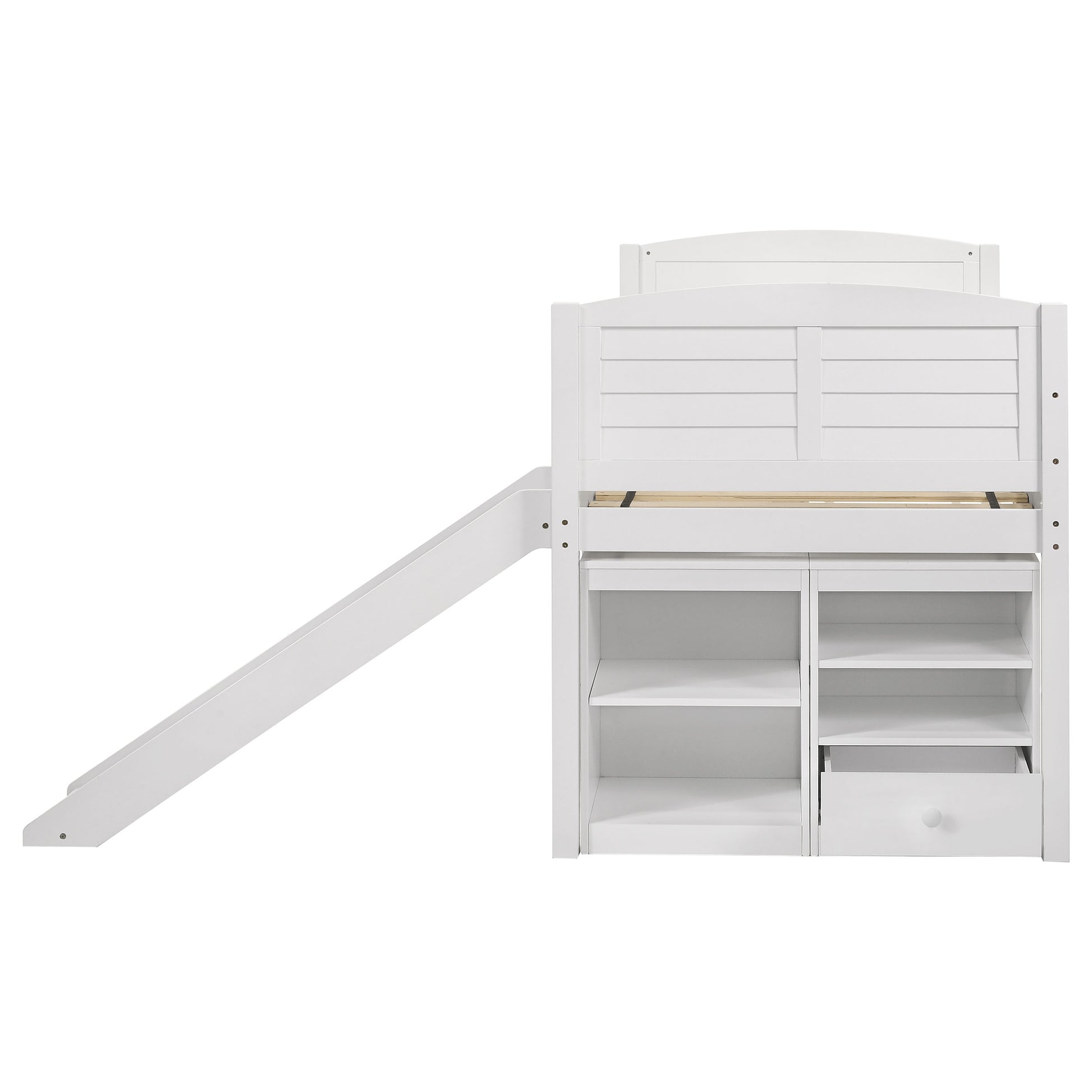 Complete your child's dream bedroom suite with this twin loft bed, complete with a playful slide and a desk for studying. With a crisp white finish throughout, this transitional loft bunk bed welcomes fun, vibrant colors of all shades and palettes. Open shelves support their favorite books and toys on several sides of the bottom portion while a desk offers a studious area for concentration and creativity. Along the headboard is a slat style design that lends a traditional touch to this charming bed frame. Adding a safety feature is side guardrails on each side of the top bunk, keeping your little one secure as they soundly sleep.