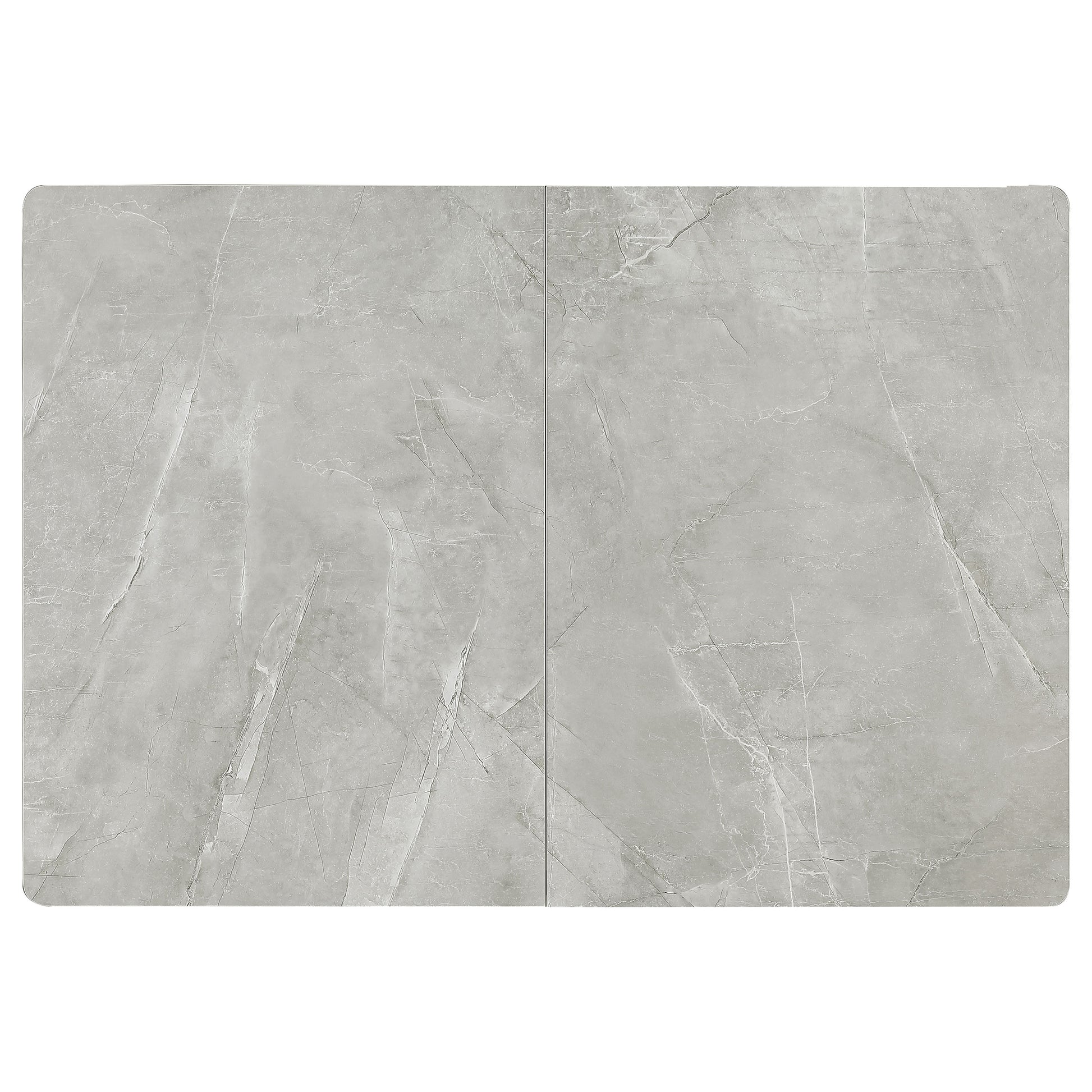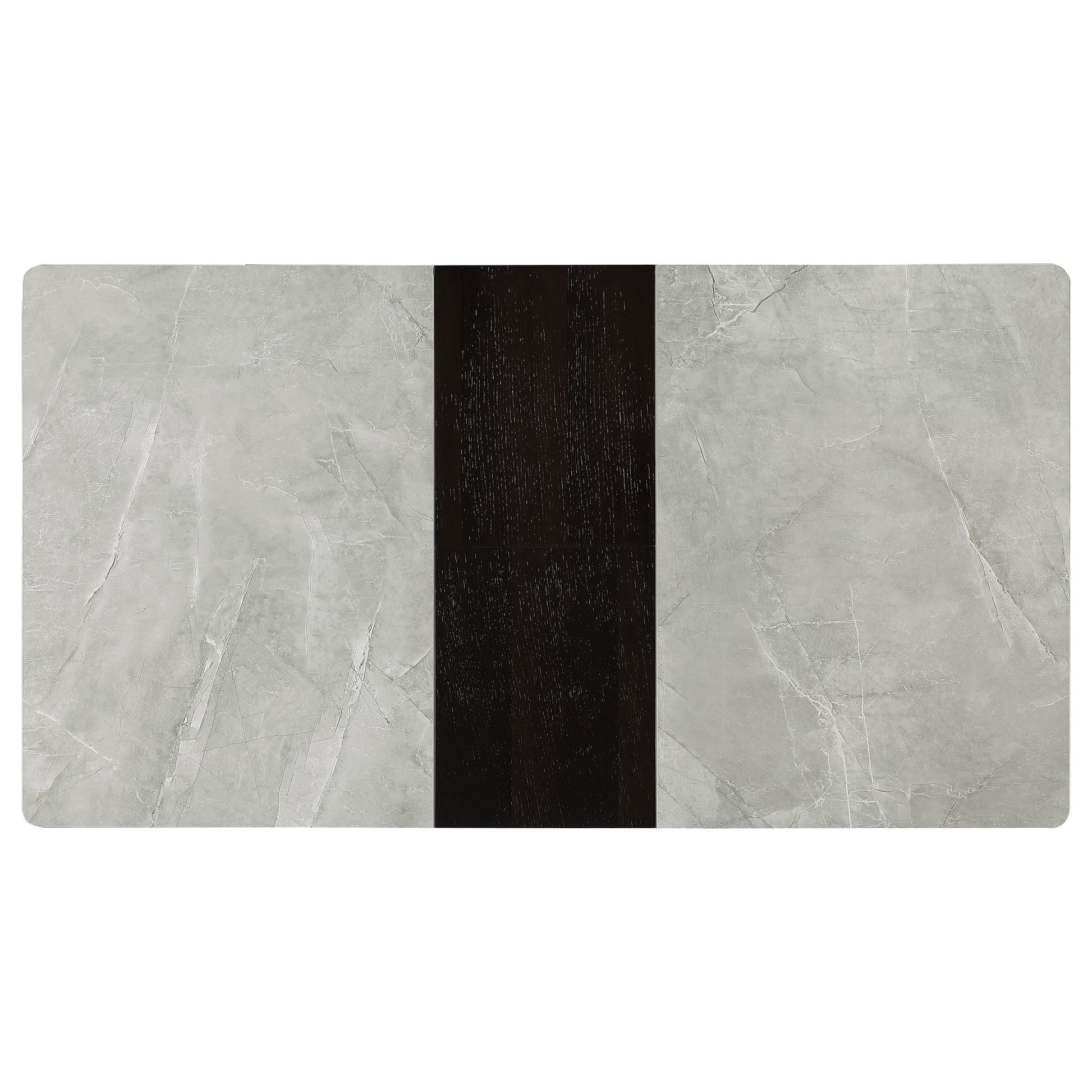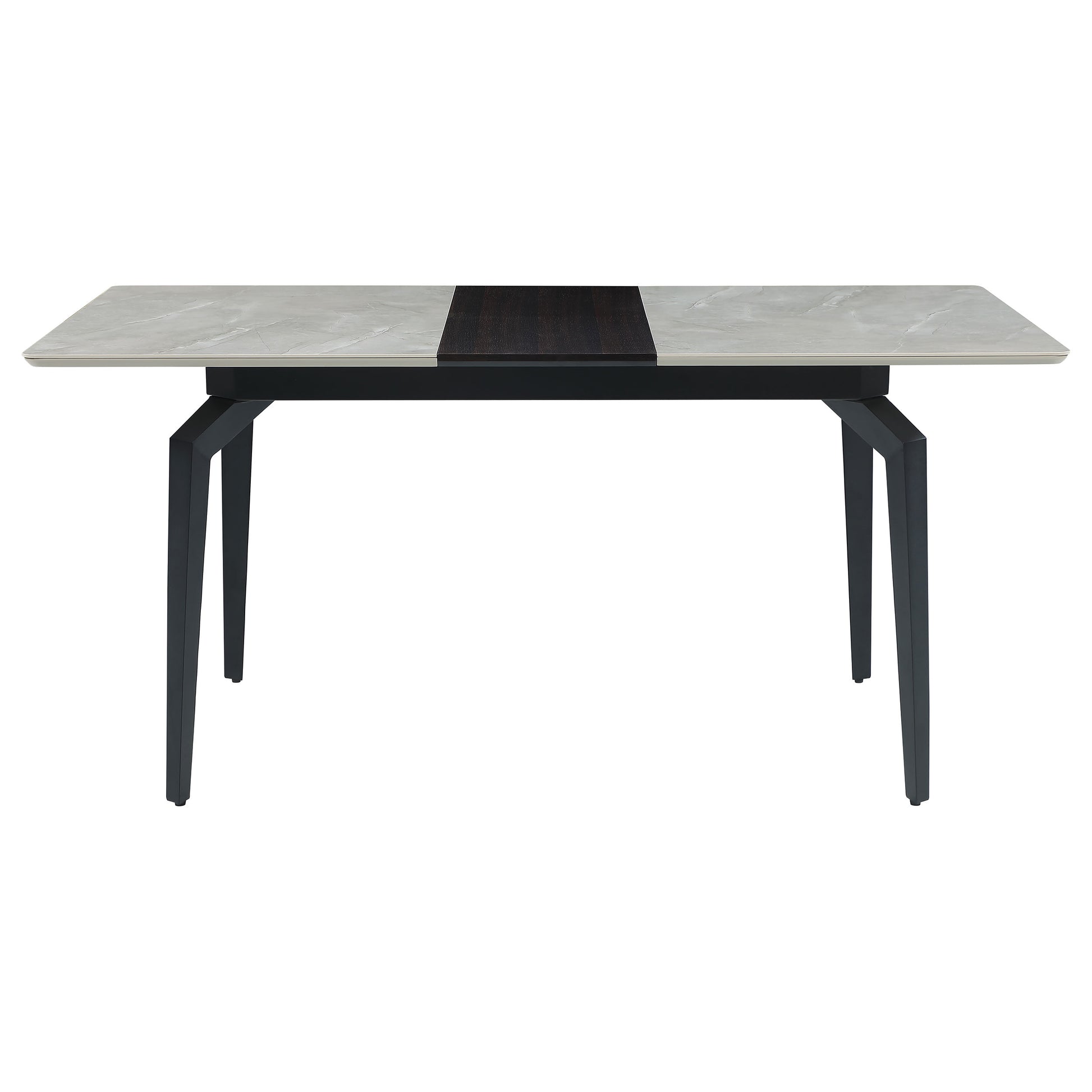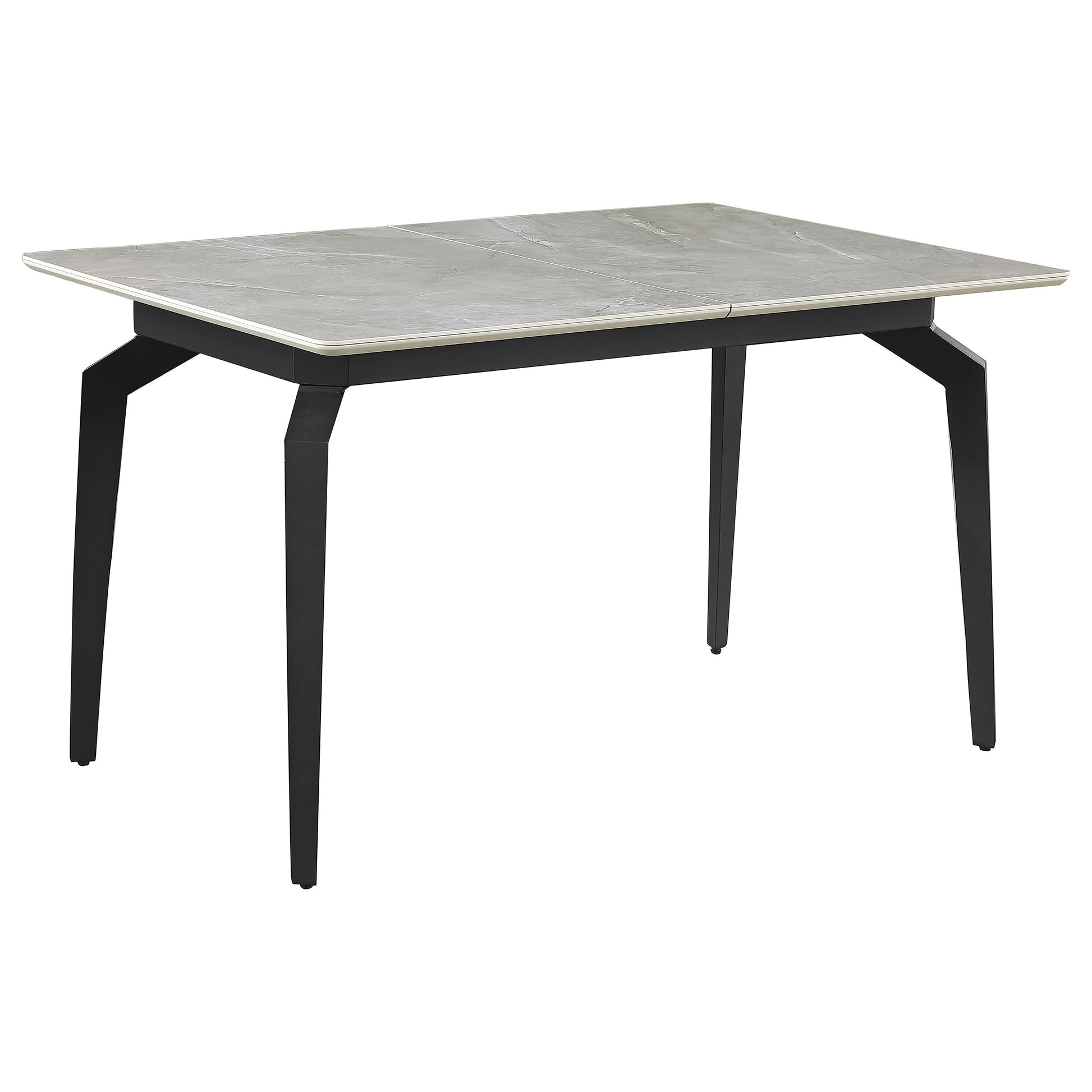 Sleek lines and sharp angles come together to create this elegant modern dining table. Designed with a gray ceramic tabletop designed to resemble marble, this dining table offers a strong and stable surface for entertaining guests. A self-storing butterfly leaf mounted on smooth metal glides lends additional space for extra guests too. Beveled edges and rounded corners soften the look of the stark lines of contrasting finishes. Long legs in a sandy black finish jut out from the top, offering a striking visual interest.