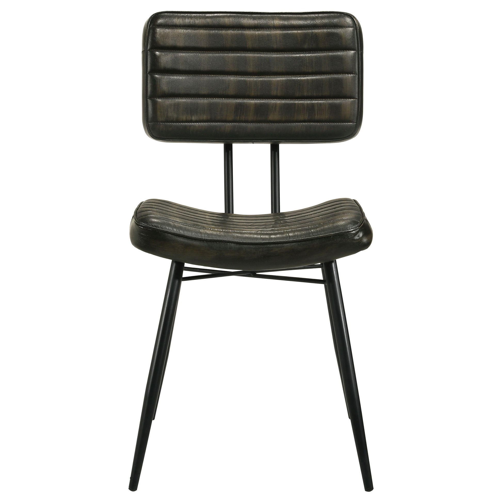Retro charm is on full display in a dining ensemble that recreates a popular past era. Warm tones and a festive look indulge Mid-Century Modern attitude in this five-piece casual dining set. A rectangular wood and iron dining table anchors this stylish set, embellished with tilted open leg braces. Side chairs and bench feature iconic retro-inspired metal framing with slender, rounded legs that splay to create perfect proportion. This set includes a rectangular dining table, four side chairs and bench with channeled tufting upholstered.