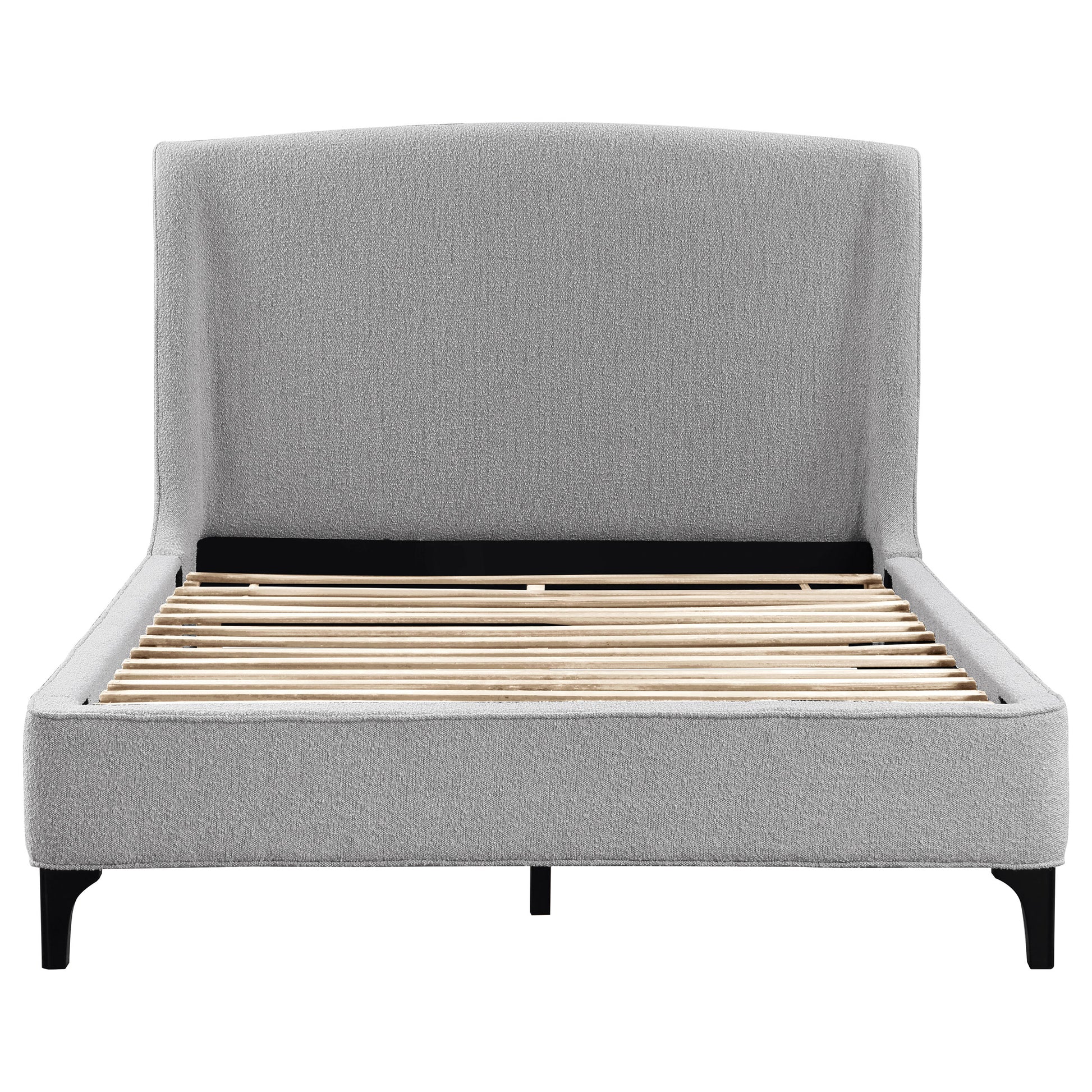 Add a touch of style and comfort to your bedroom with this upholstered bed. Its gentle curved headboard and thick sides are padded with trendy grey chunky boucle fabric. The whole frame is covered in the same soft fabric, creating a cozy and inviting look. The texture adds sophistication, making it a visually stunning piece that is both comfortable to sit on and admire from afar.