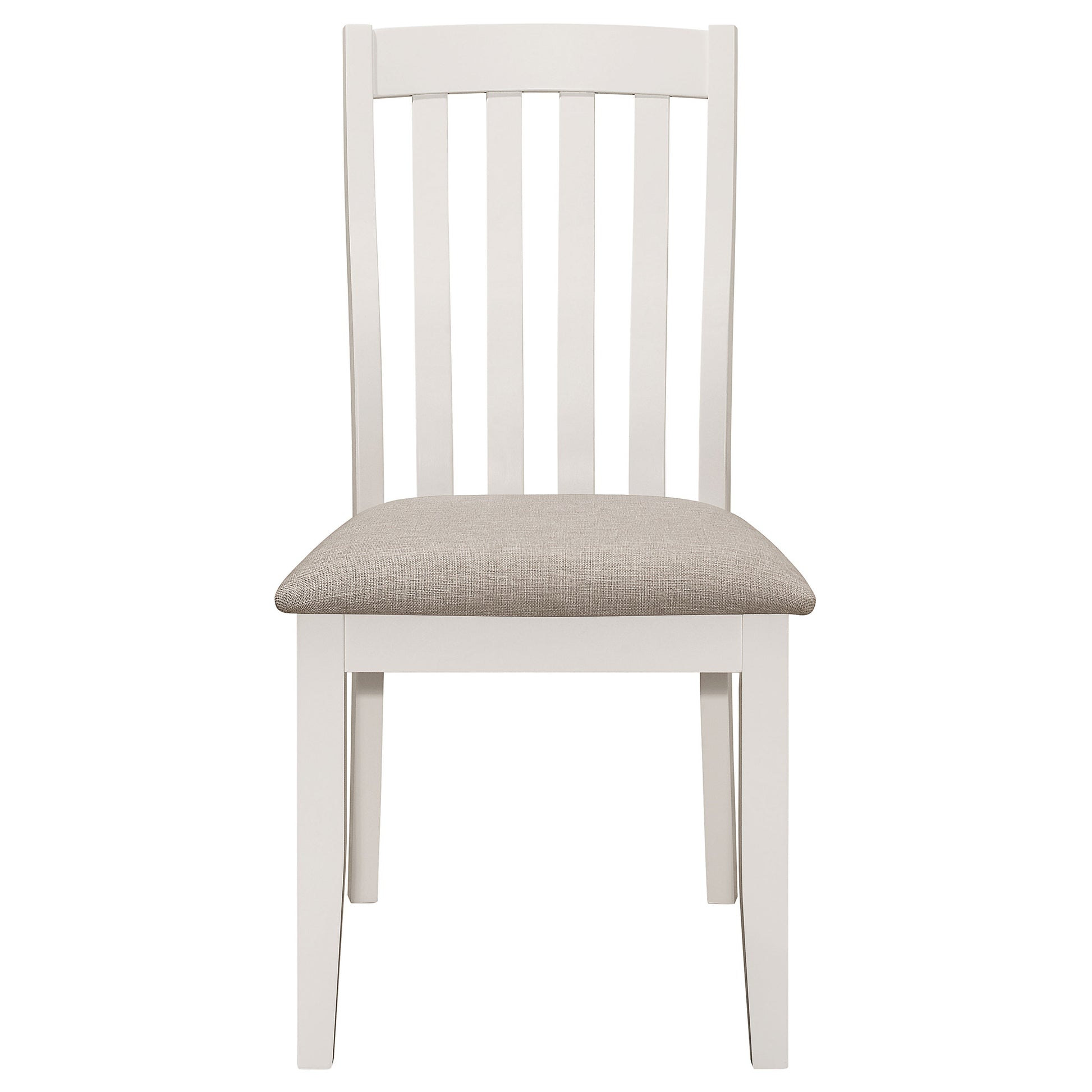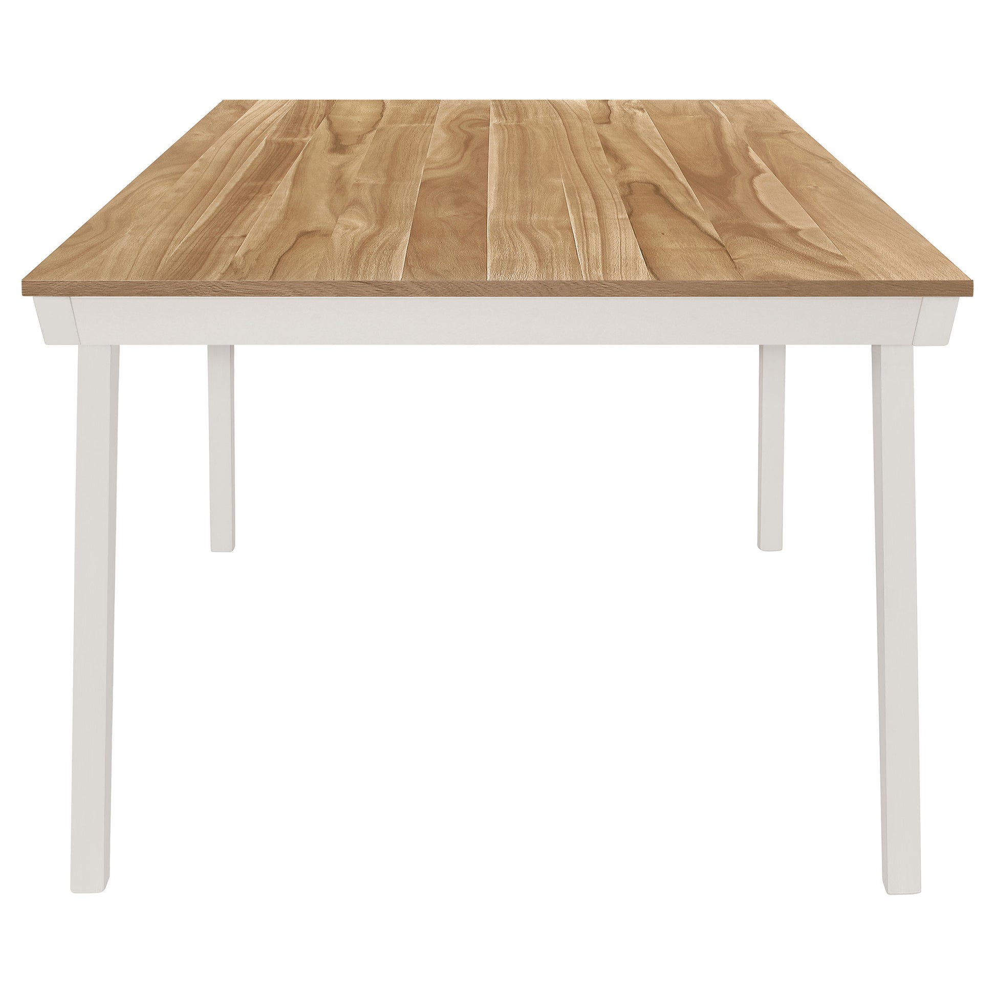 Choose a dining table that suits your welcoming, casual home. This seven-piece modern farmhouse dining set centers on a charming rectangular table with a two-tone finish that pairs a natural acacia wood table top with a white base, offering refreshing lightness to brighten every meal. Understated design details include splayed legs and a tapered apron, delivering a touch of angularity that translates well to casual contemporary decor. Six side chairs offer a matching white finish over slatted backs that establish an airy, open presence and feature padded seats with light brown upholstery to complement a neutral color palette. Make daily meals more enjoyable and look forward to hosting family gatherings and holidays with all your favorite people.