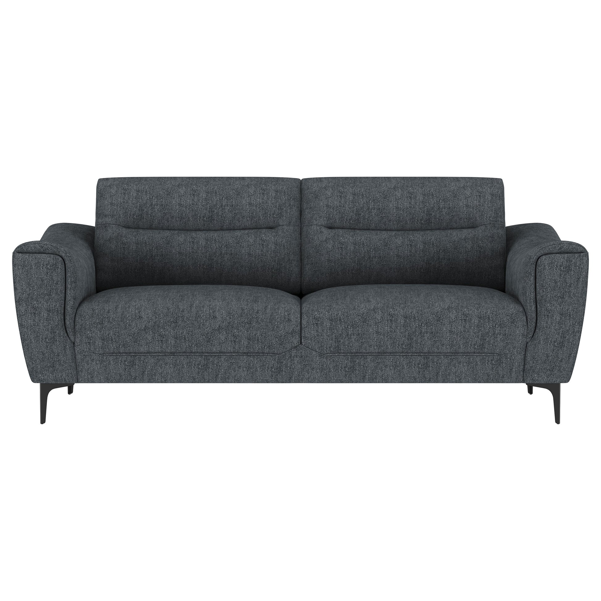 Indulge in effortless style and comfort with this chic transitional sofa. Soft charcoal upholstery gracefully harmonizes with any décor, while plush pocket coil seat cushions and modern track arms provide inviting support for your downtime. Designed with attached cushions for a neat appearance and innovative metal legs that allow for easy assembly, this collection elevates the overall ambiance of your living space.