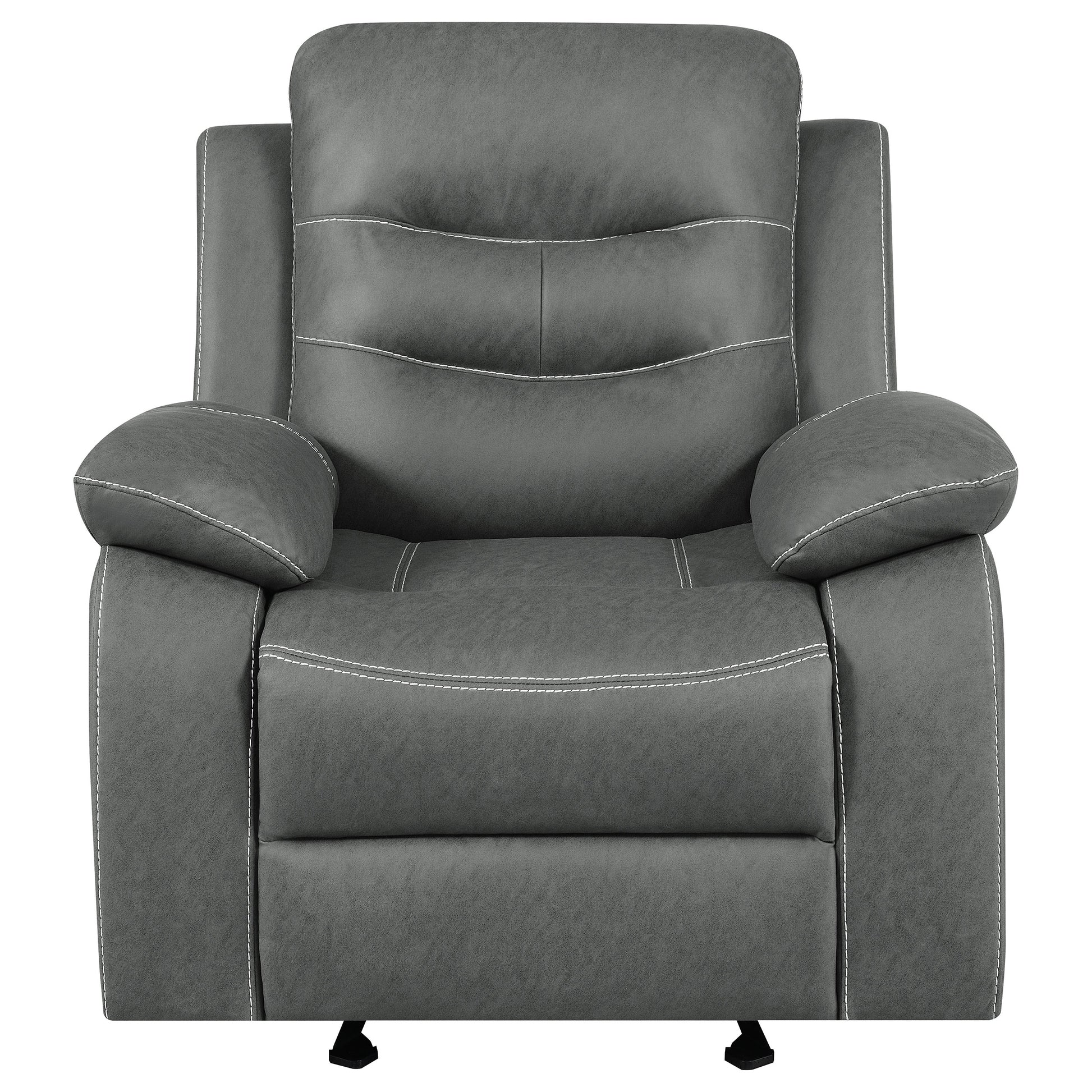 Ultra-cozy in both style and seating experience, the glider recliner is ideal for entertaining or solo personal relaxation. Pillowy polyester fiber padding in all the right places supports seating comfort and offers a design boost through tufting and layering. Cool dark grey microfiber leather upholstery is pleasing and contemporary in a wood-framed glider recliner with pocket coil seating. Manual reclining creates customized positions for everything from socializing to napping, as a gliding motion embellishes its comfort level. A wall-hugger design saves space, making this glider recliner a good choice for both large and compact spaces.