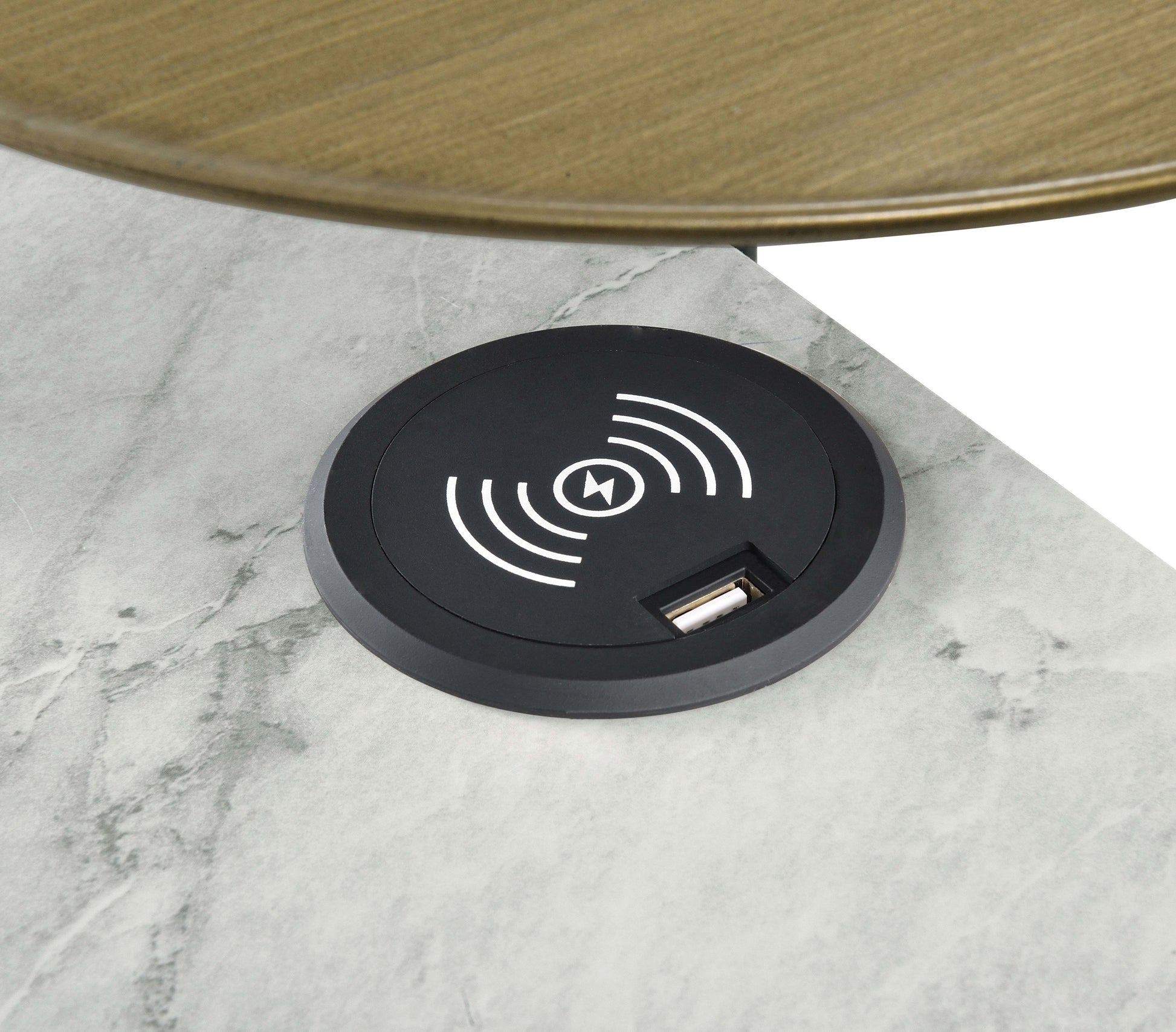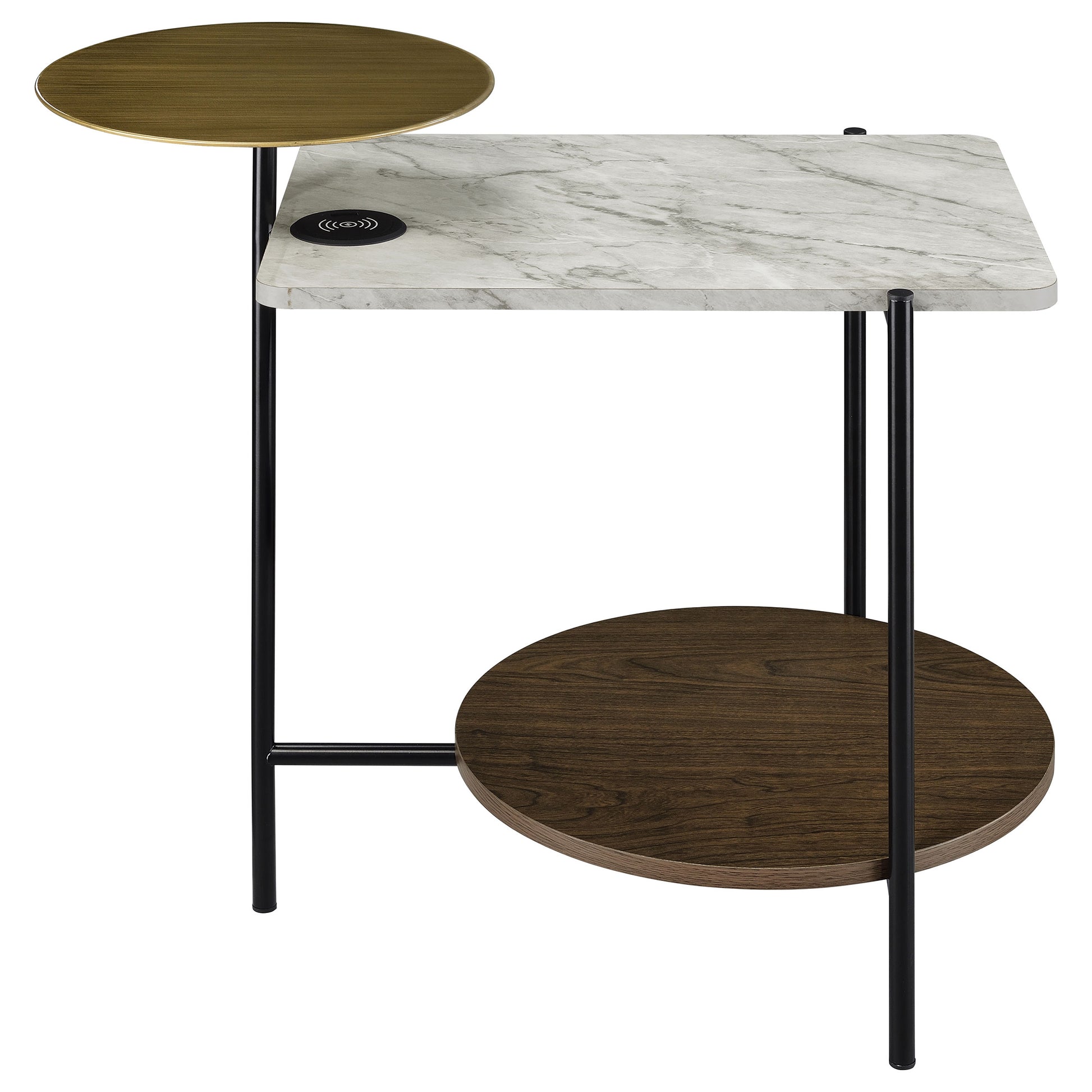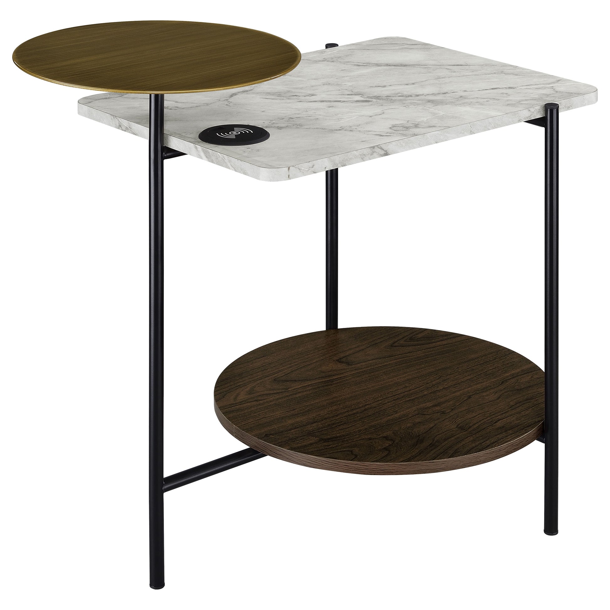 Outfit your favorite sitting area with plenty of modern functionality without sacrificing style. A contemporary tiered side table is a charming solution, perfect flanking an armchair or reclining sofa. It features a clean-lined design with a main tabletop in a white marble paper finish that adds luxe energy. The tabletop includes a wireless charger and USB port, perfect for keeping your personal electronics charged and ready. Two additional surfaces, one above and one below, feature round profiles and a rich wood grain finish and establish the layered presentation of the table.