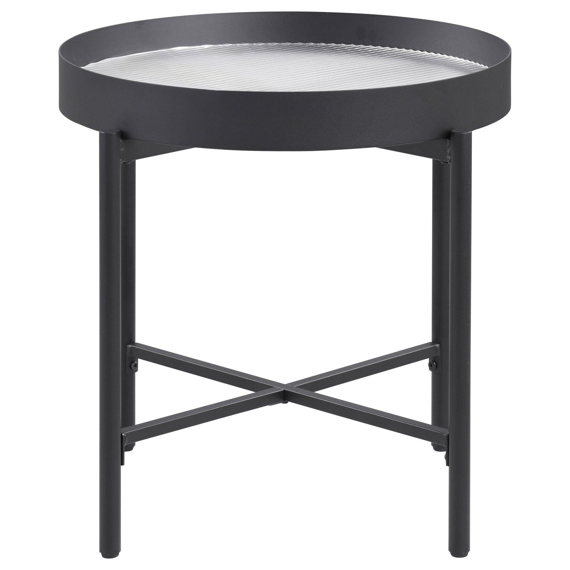 This elegant accent table invites modern style into your living room. With a sleek metal frame in a sandy black powder coated finish and a tempered reeded glass top, it effortlessly transforms into an occasional table or utility table. Whether placed beside a sofa as a side table or used to display décor as an end table, its versatile silhouette blends artistry, practicality, and timeless design into any contemporary space.