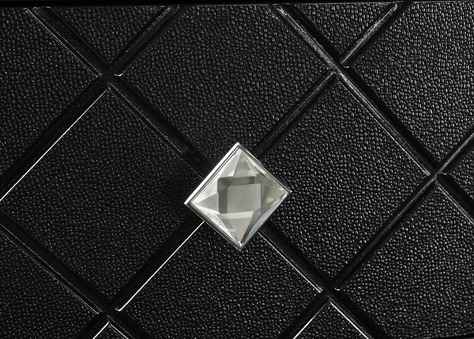 Glitz and glam will overtake your sleeping space with this incredible black dresser. Six drawers display embossed panels with a geometric pattern. The diamond-style acrylic hardware makes for an incredible and elegant upgrade for this contemporary piece. A spacious tabletop brings plenty of space to display decorative items and bedside essentials. Enjoy years of durability and beauty from this piece, crafted from quality rubberwood.