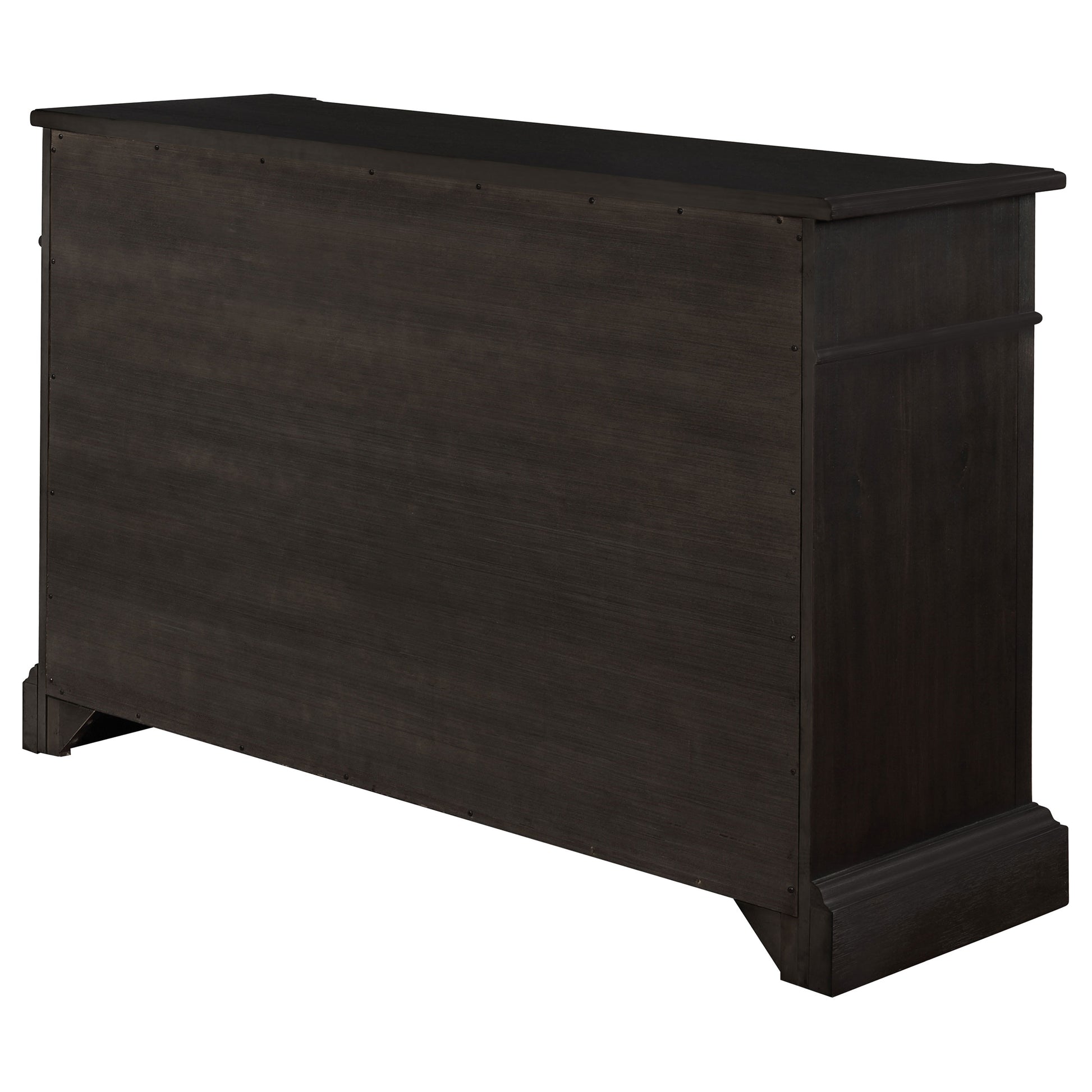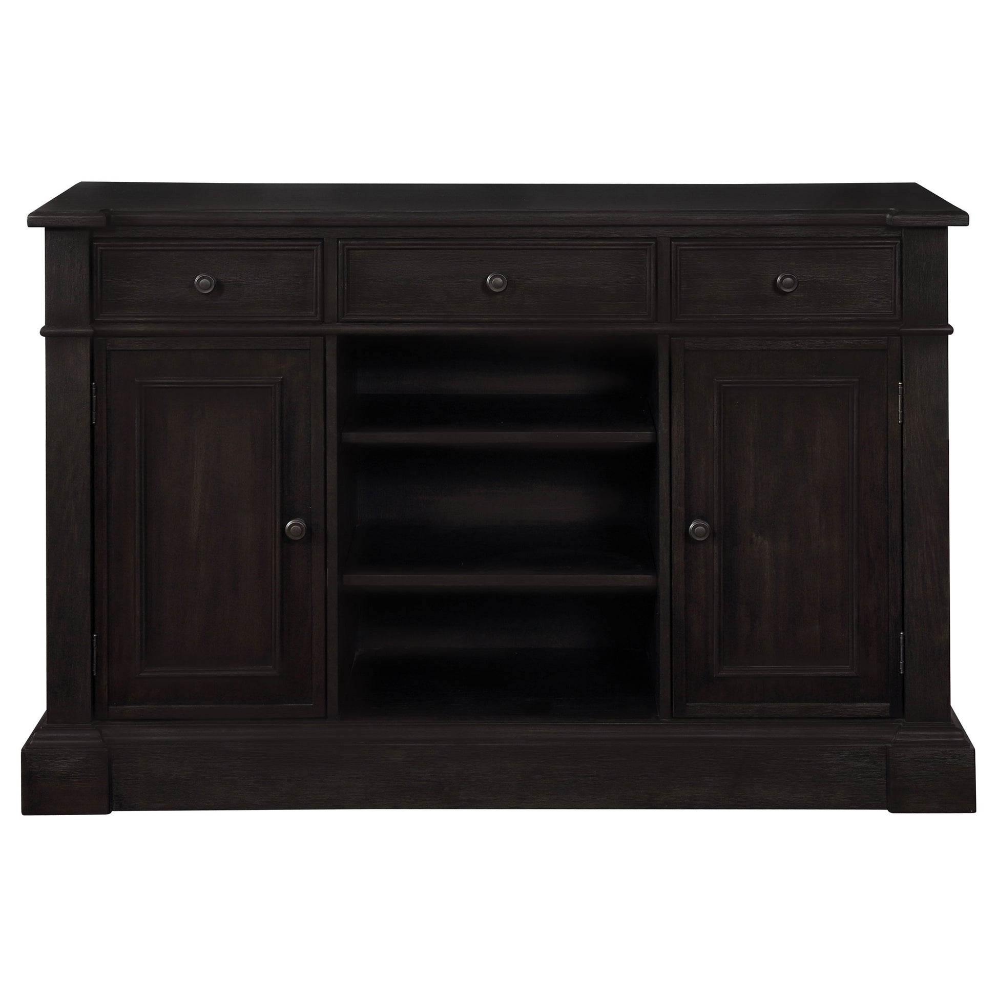 Refined elegance meets everyday versatility in this beautifully crafted sideboard, designed to elevate any dining space. With its antique noir finish, this piece exudes a sense of timeless sophistication, effortlessly complementing both formal and casual settings. Built from poplar, engineered wood, and acacia veneer, it offers a perfect blend of durability and charm. Three drawers and two cabinet doors provide ample hidden storage, while six adjustable shelves allow for customizable organization. The open center cubbies create an inviting space to showcase decorative serveware, making this sideboard as functional as it is stunning.