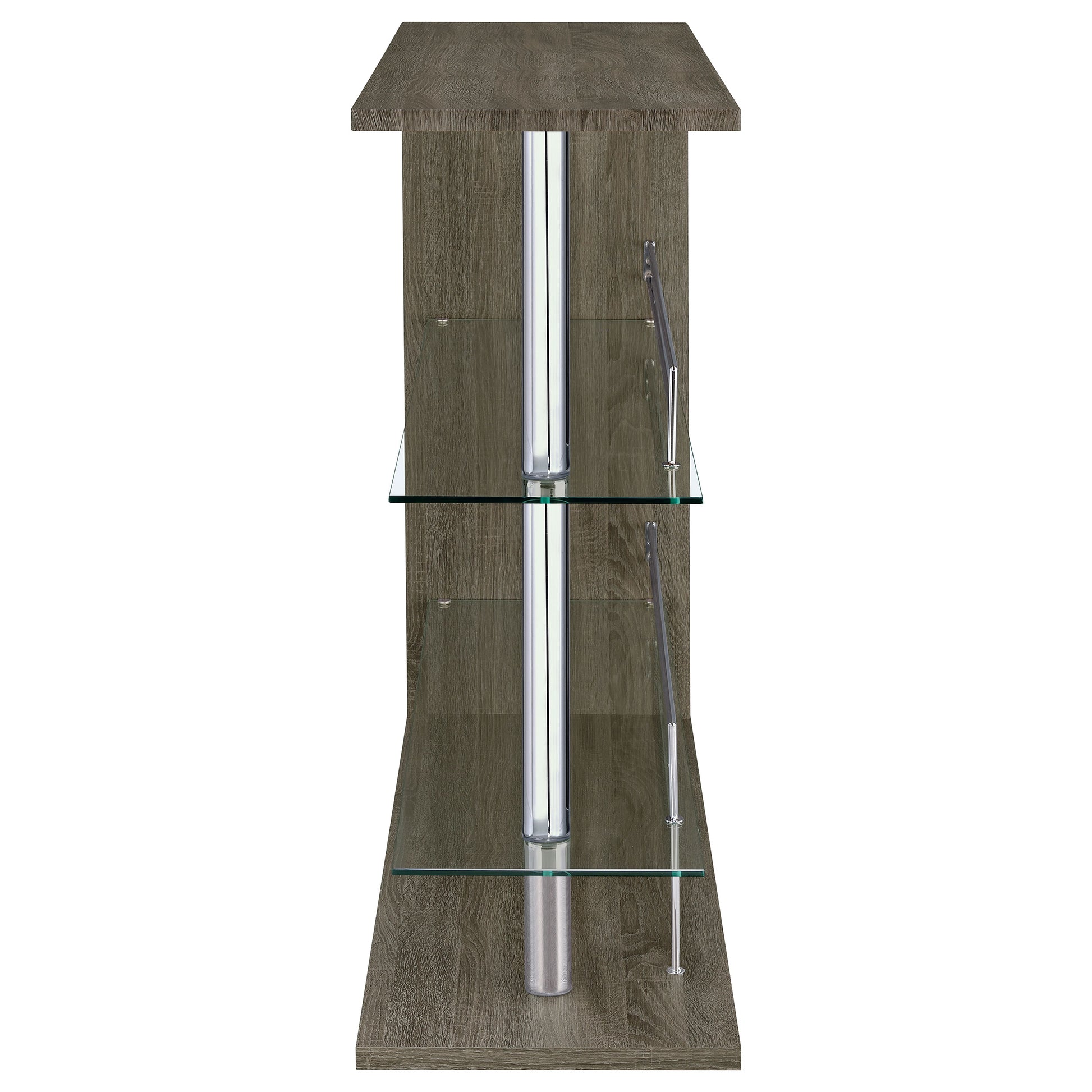 Take home entertainment to the next level with the versatile beauty of this lovely metal bar unit. With class, grace, and exquisite taste, it lends effortless glamour to a living or dining area. Equipped with a handy stemware rack and two tempered glass shelves, this unit provides convenient storage for all your entertaining needs. Its sleek, stylish silhouette and shining chrome accents blend seamlessly with a variety of decor styles. Shown here in weathered grey, this bar table is available in four appealing finishes to complement the color scheme of any home.