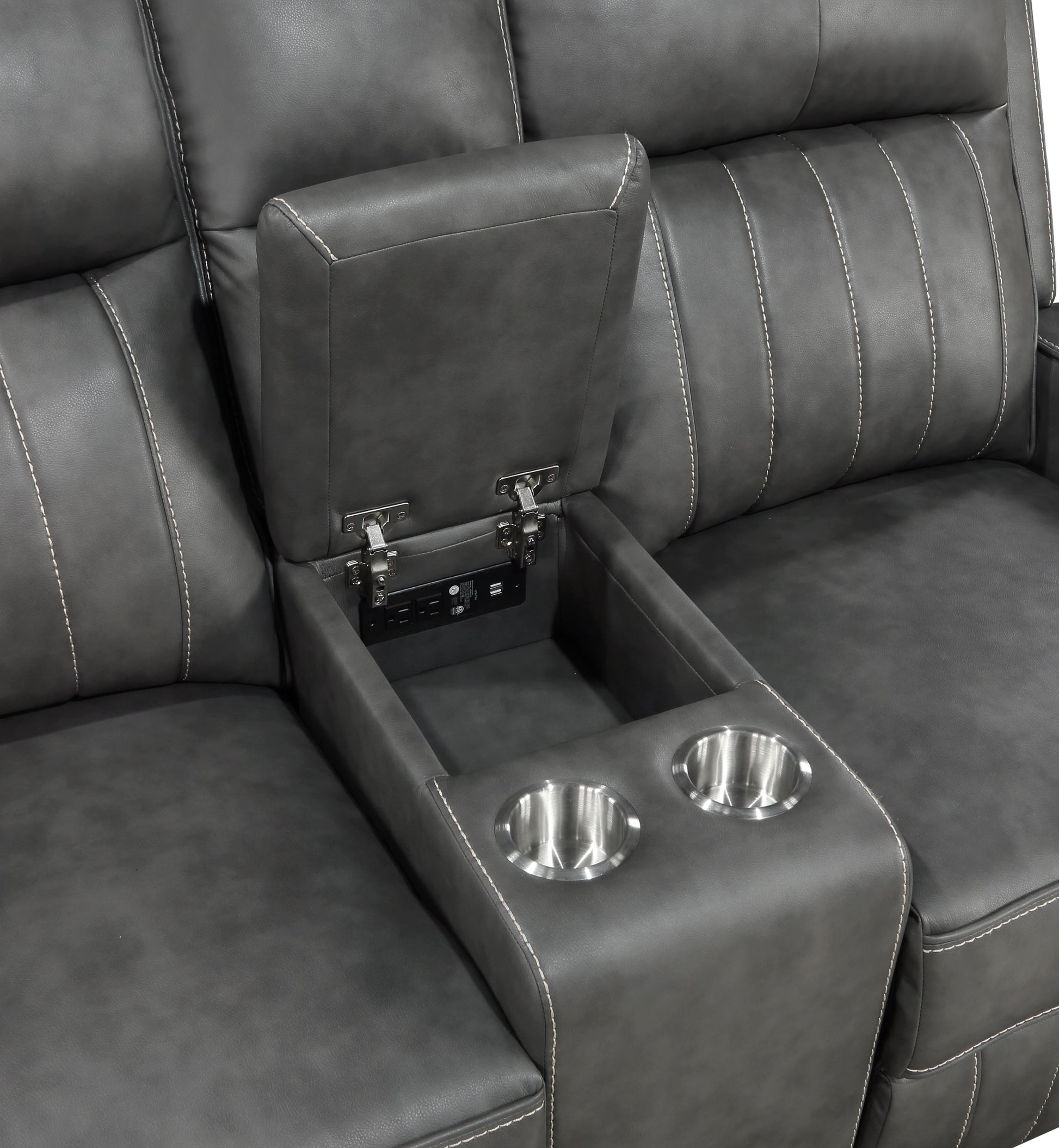 Merging the classic style of both contemporary and transitional design schemes, the two-piece sofa and loveseat set creates a dreamy venue for relaxing. The trending look of smooth grey leatherette upholstery with vertical topstitching delivers decorative elements and a dimensional impact. This motion-reclining set features foam padding on its frames and pocket coil spring seat cushions, as attached back cushions are capped with ultra-plump headrests. Recline into varying positions using a manual control function, and enjoy space efficiency with its wall-hugger design. Bonus features include a center-mounted loveseat console with a flip-top storage bin and a pair of handy beverage holders.