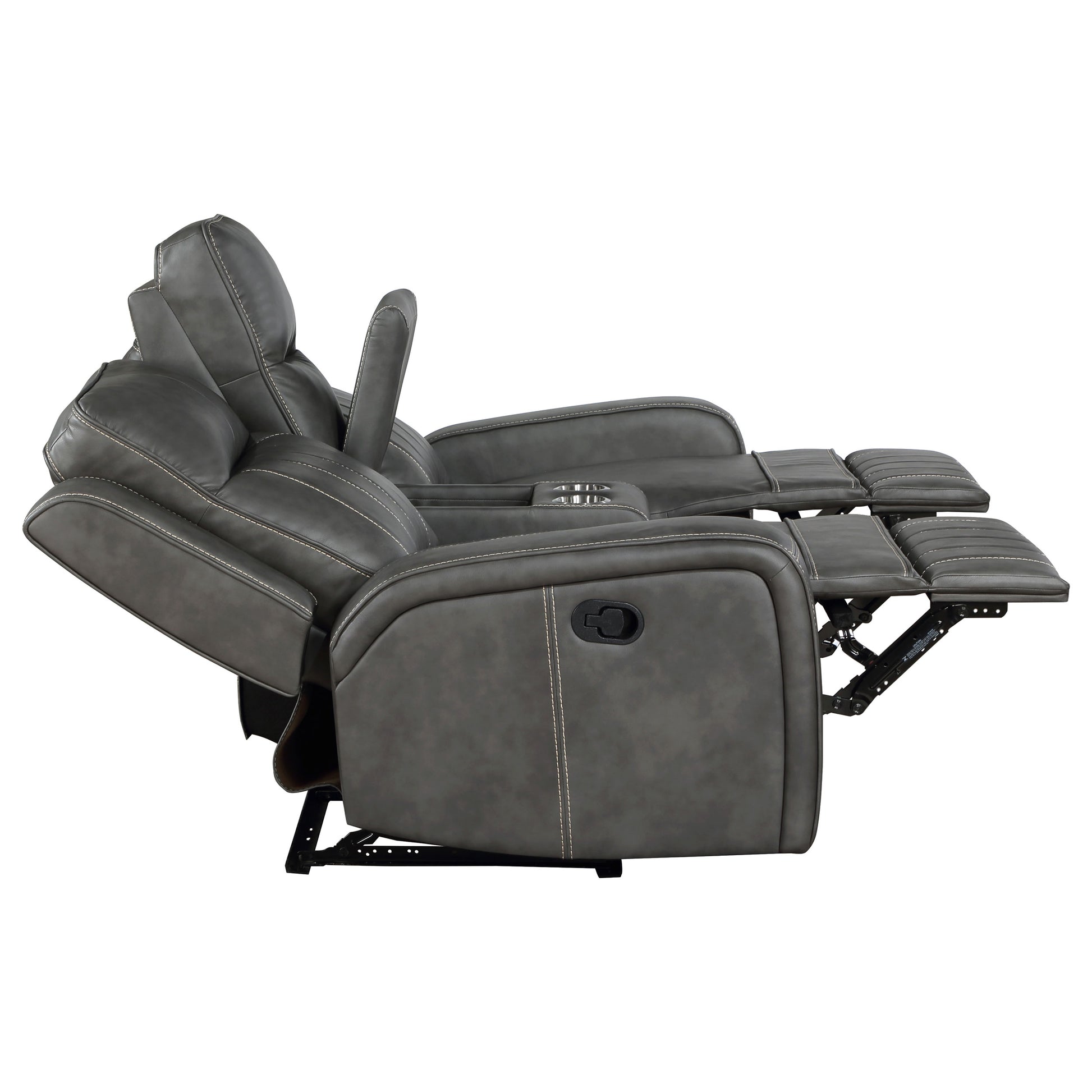 Merging the classic style of both contemporary and transitional design schemes, the motion loveseat creates a dreamy venue for relaxing and entertaining. Choose a pleasing motion loveseat covered in smooth grey leatherette upholstery with vertical topstitching adding decorative elements and a dimensional impact. This loveseat features foam padding on its frame and pocket coil spring seat cushions, as attached back cushions are capped with ultra-plump headrests. Recline into varying positions using a manual control function, and enjoy space efficiency with its wall-hugger design. A convenient center unit features a flip-top console for storing remotes and accessories, and two cup holders to keep beverages handy.