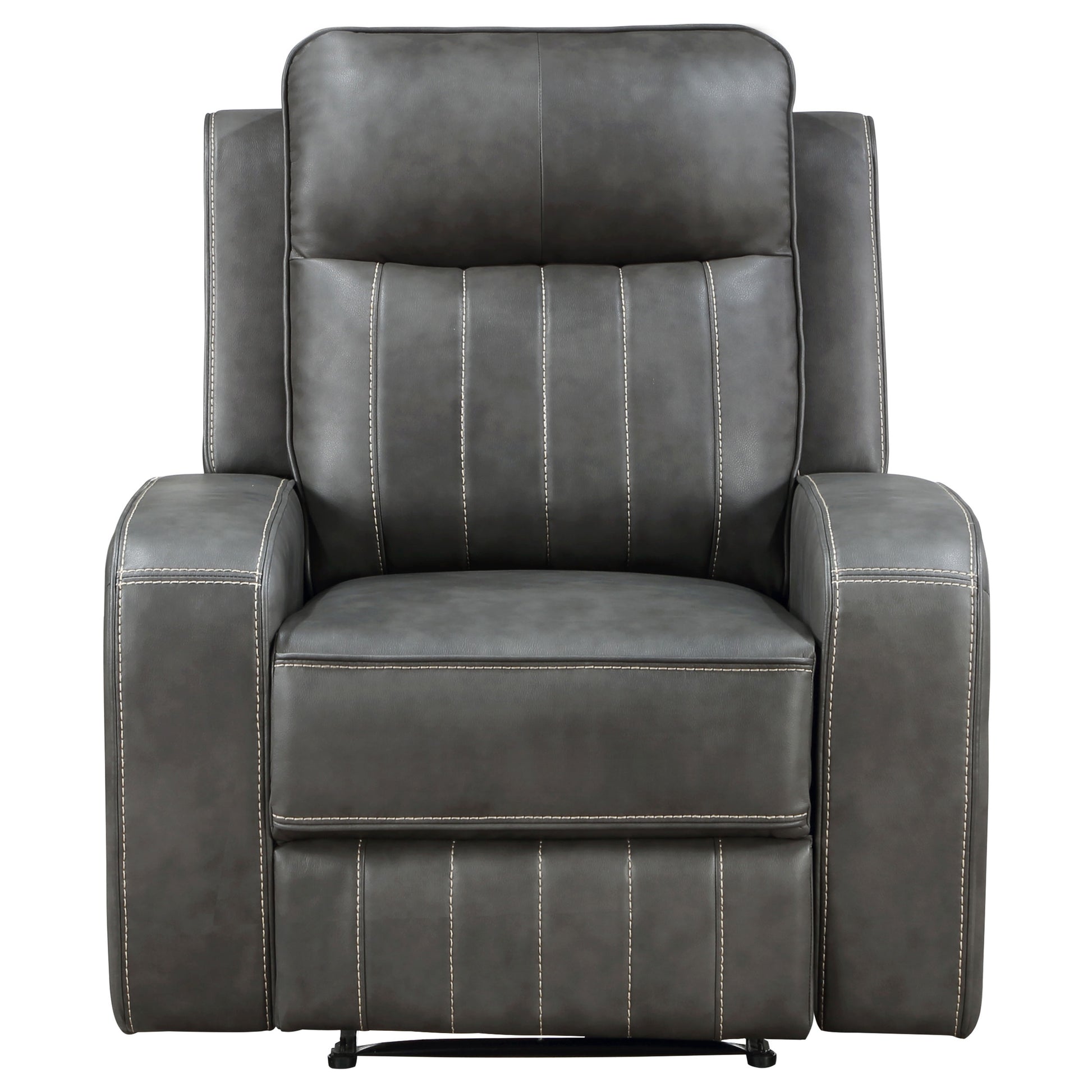 Merging the classic style of both contemporary and transitional design schemes, the recliner creates a dreamy venue for relaxing. The trending look of smooth grey leatherette upholstery with vertical topstitching delivers decorative elements and a dimensional impact. This recliner features foam padding on its frame and a pocket coil spring seat cushion, as an attached back cushion is capped with an ultra-plump headrest. Recline into varying positions using a manual control function, and enjoy space efficiency with its wall-hugger design. This recliner chair offers the perfect blend of stylish updated aesthetics and an ultimately cozy seating venue.