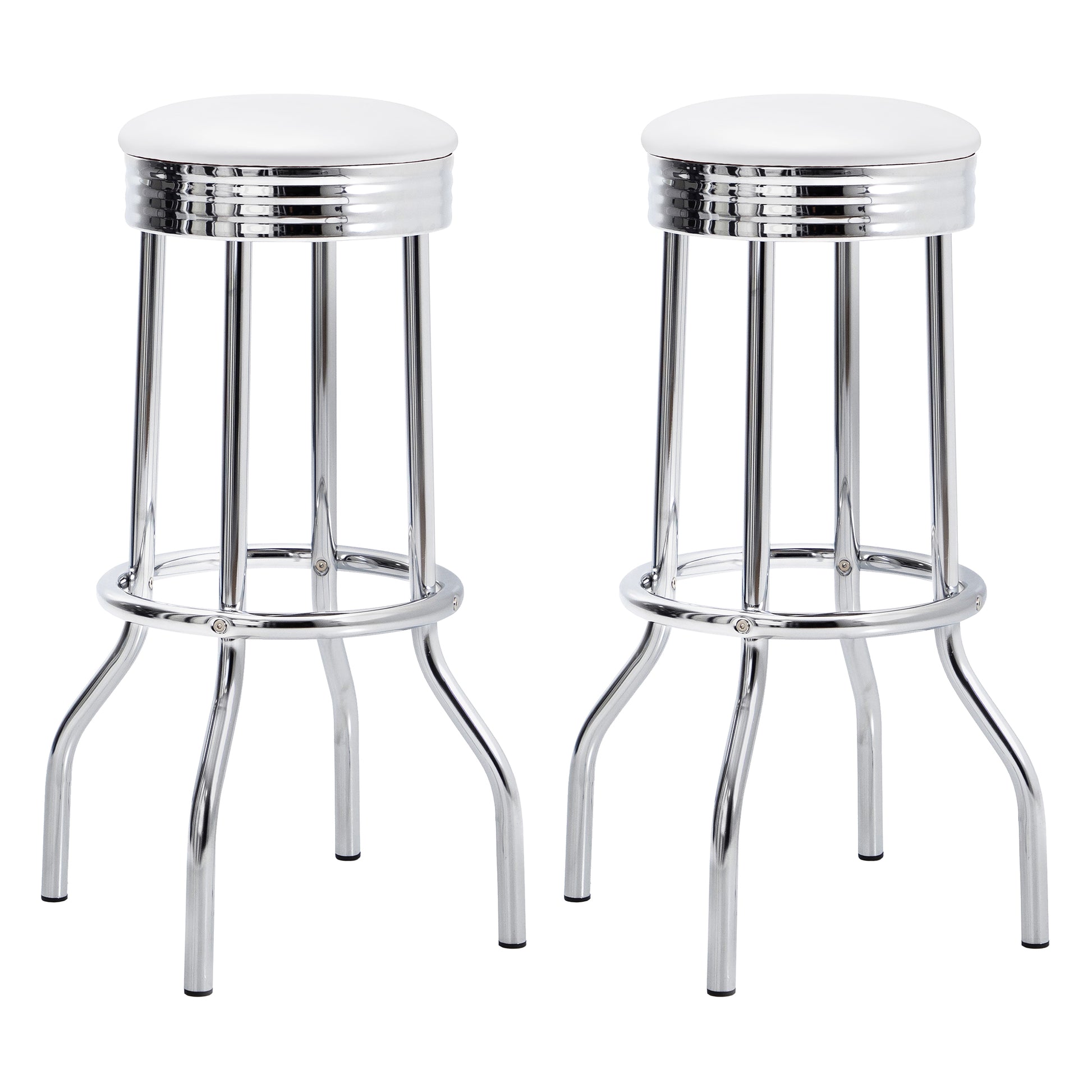 Bring nostalgic charm to your home with this retro swivel bar stool, blending diner-inspired design with modern comfort. A round padded seat in white leatherette pairs effortlessly with a ribbed chrome apron for vintage appeal. The electroplated chrome base provides stability with flared legs and a supportive footrest. Crafted from heavy gauge metal and cushioned with foam, it offers smooth 360-degree swivel functionality perfect for everyday use.