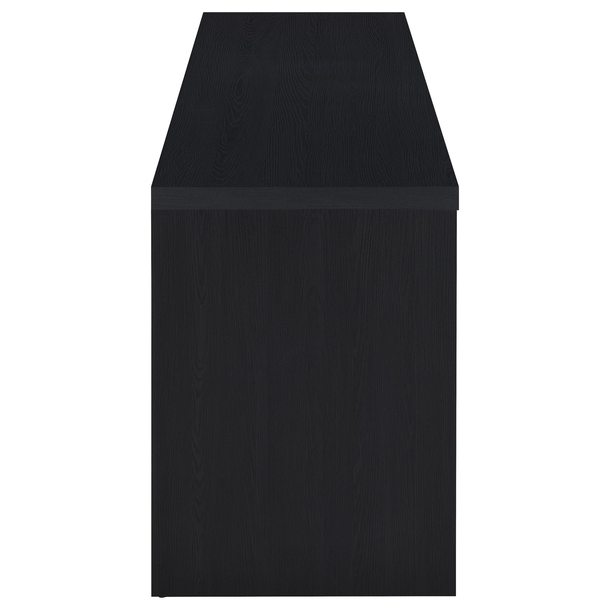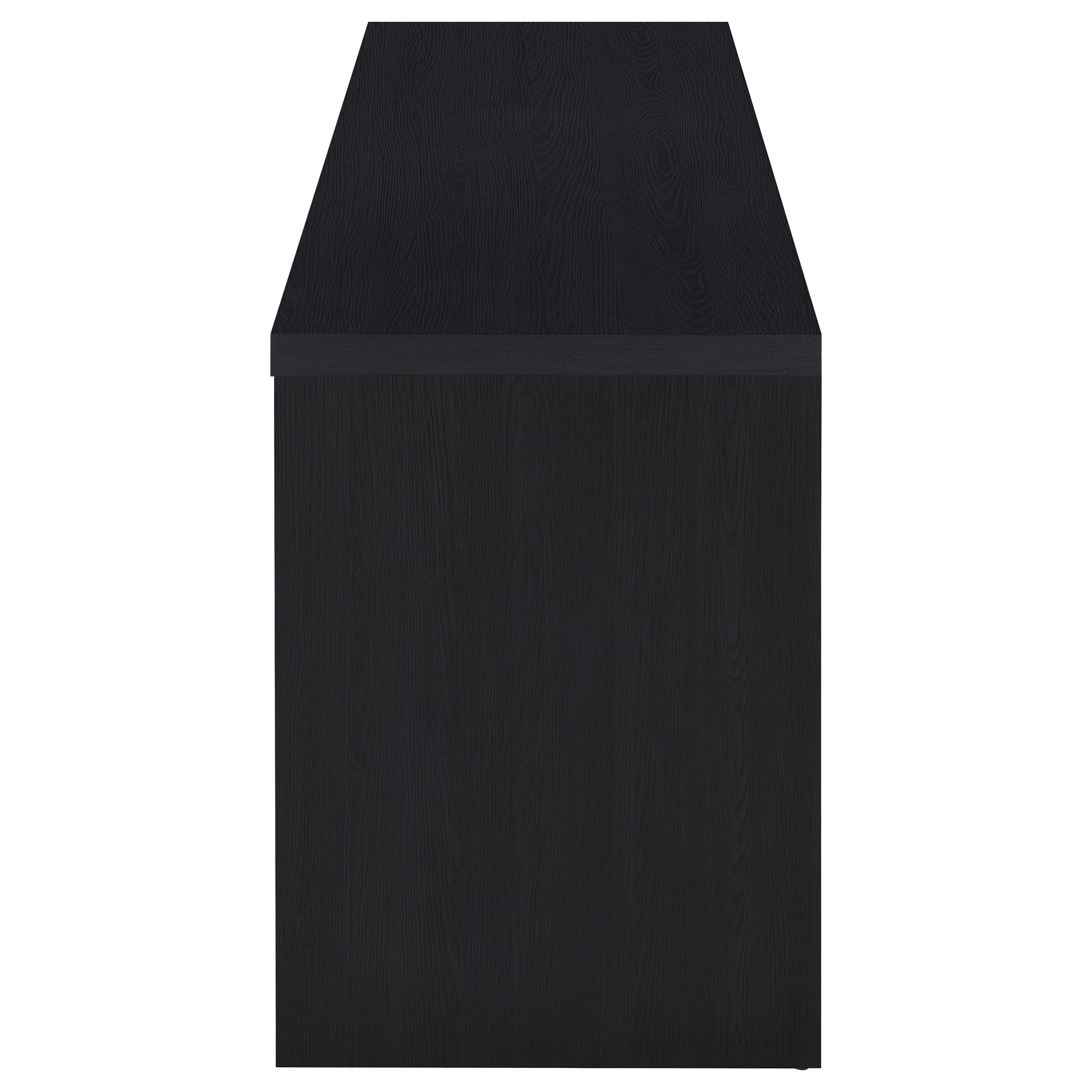 Upgrade your entertainment space with this black TV stand, crafted from engineered wood with a paper laminate veneer for durability and a sleek finish. The clean lines and modern design include open shelves for electronics, a wire management hole to reduce clutter, and three concealed drawers for organized storage. Perfect for flat-screen TVs, this media console combines style and functionality for any contemporary setup.