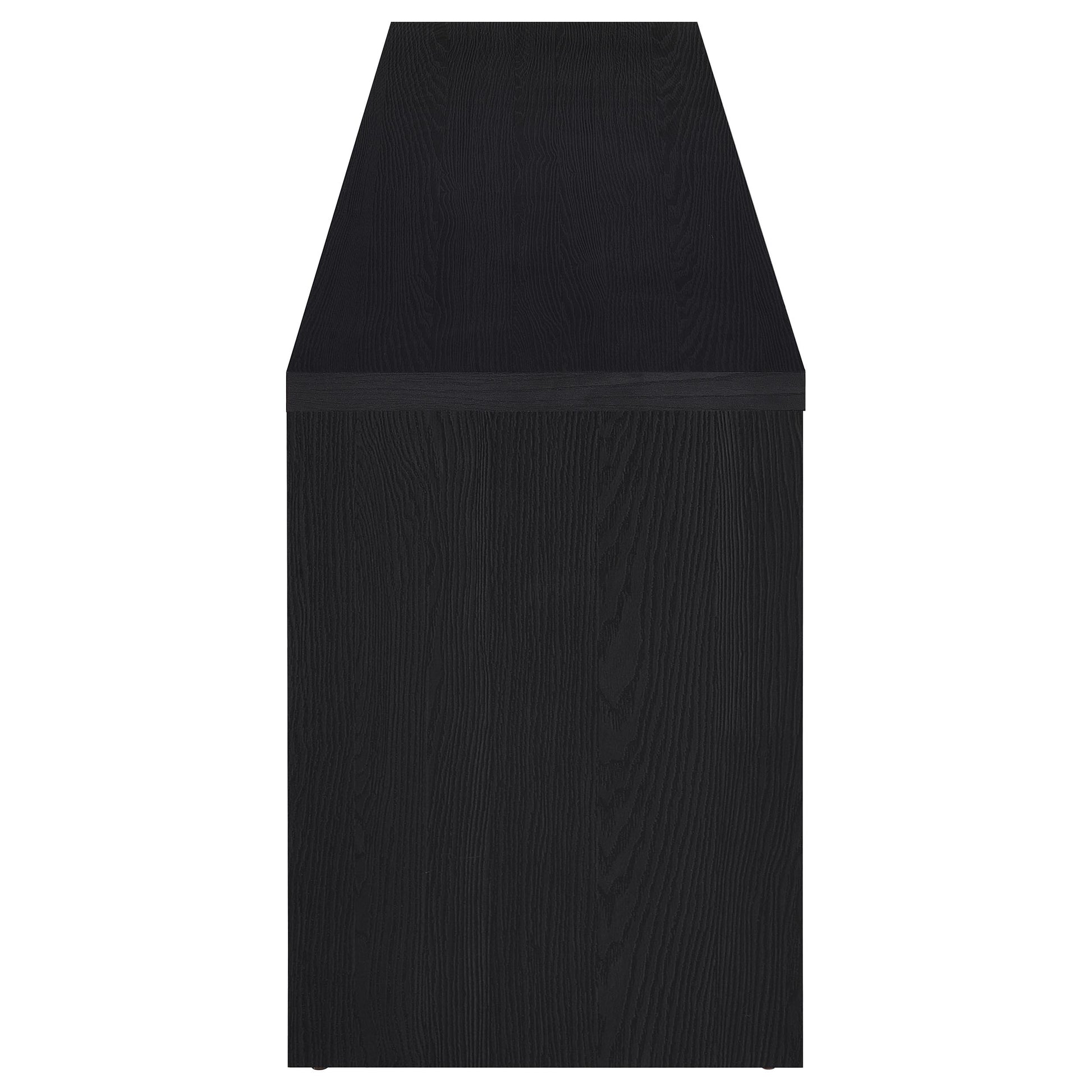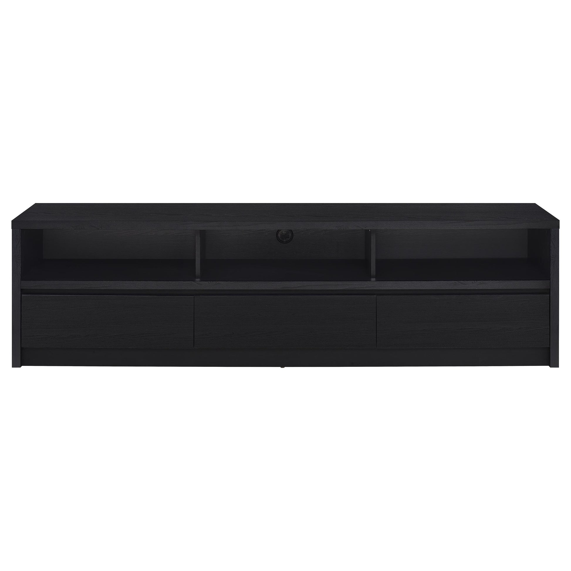 Upgrade your entertainment space with this black TV stand, crafted from engineered wood with a paper laminate veneer for durability and a sleek finish. The clean lines and modern design include open shelves for electronics, a wire management hole to reduce clutter, and three concealed drawers for organized storage. Perfect for flat-screen TVs, this media console combines style and functionality for any contemporary setup.