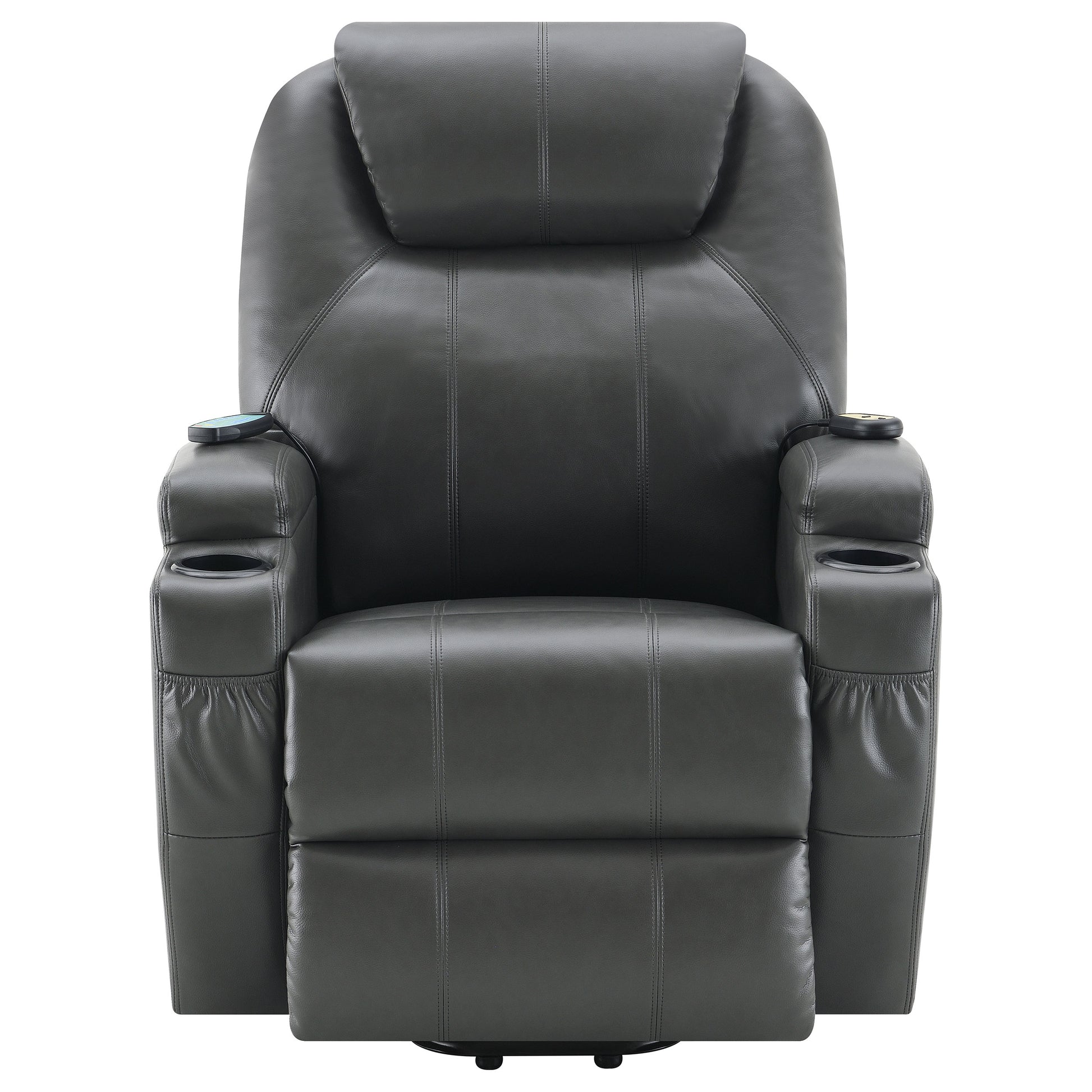 Fall in love with the sleek look and easy power lift functionality of a modern power recliner in soft, supple faux leather. Impeccably designed for both style and indulgent comfort, the recliner features pocket coils and foam cushioning, with track-style armrests capped with built-in cupholders for added convenience. Massage and heat functions provide soothing relief, while a remote control allows seamless adjustment of recline and lift settings. A plush headrest, covered leg rest, and side pocket for essentials complete this indulgent seating experience.