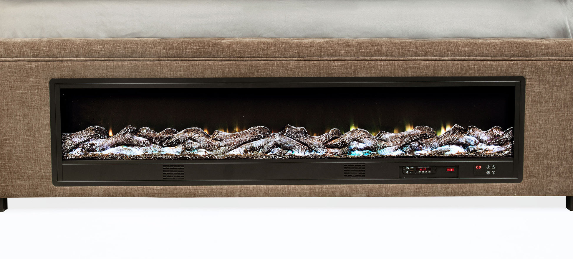 Elegance and functionality converge in this upholstered bed, designed to enhance both comfort and ambiance in your bedroom. The tufted headboard and soft fabric upholstery create a timeless, sophisticated look, while the footboard’s visual flame box insert serves as a striking centerpiece. Constructed with durable pine, plywood, and engineered wood, this bed ensures longevity and luxury. Modern features, including a built-in Bluetooth speaker and wireless remote control, add convenience and contemporary flair.